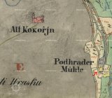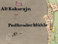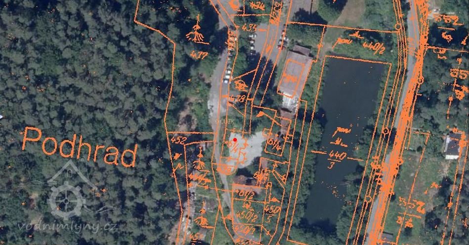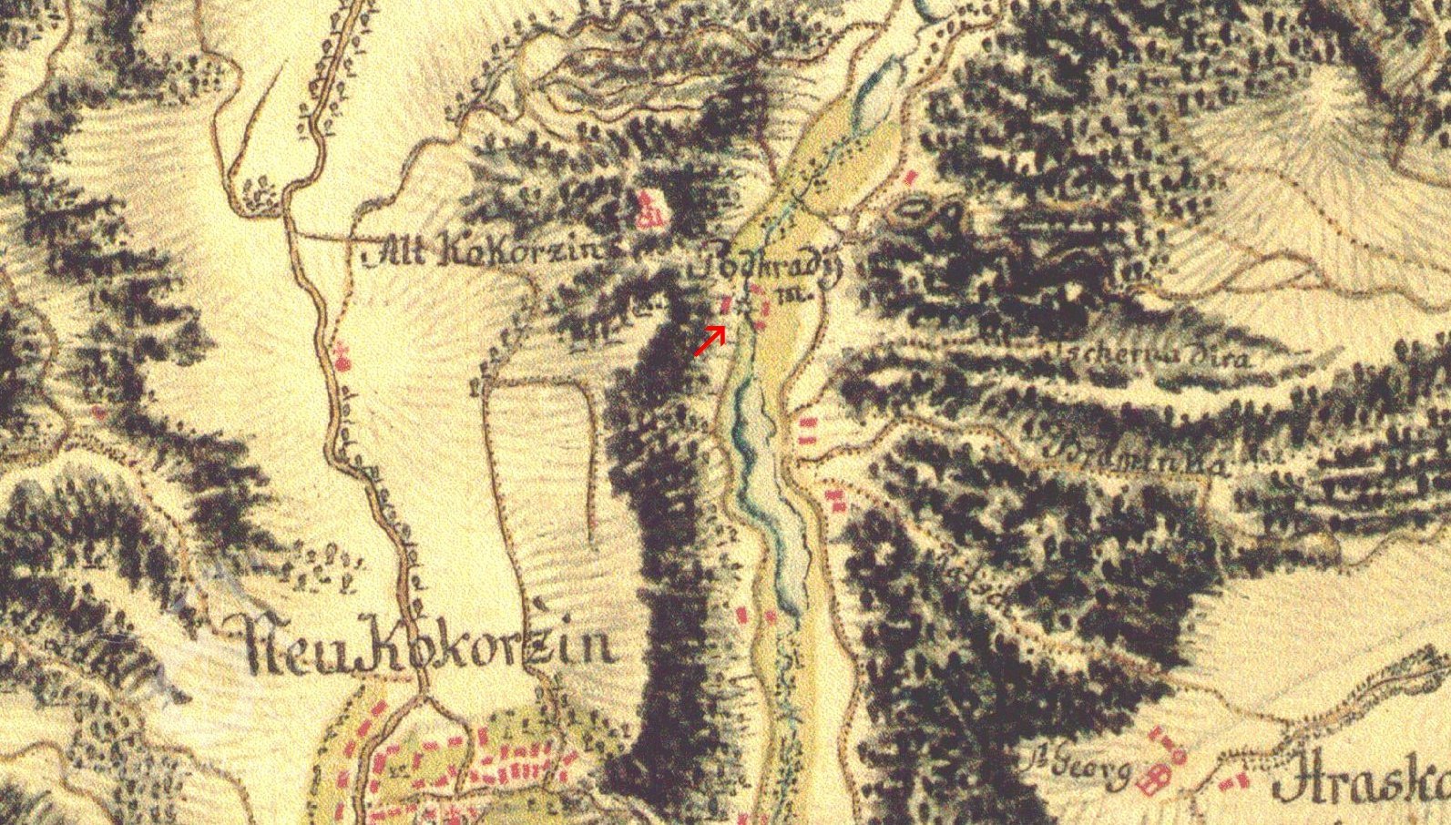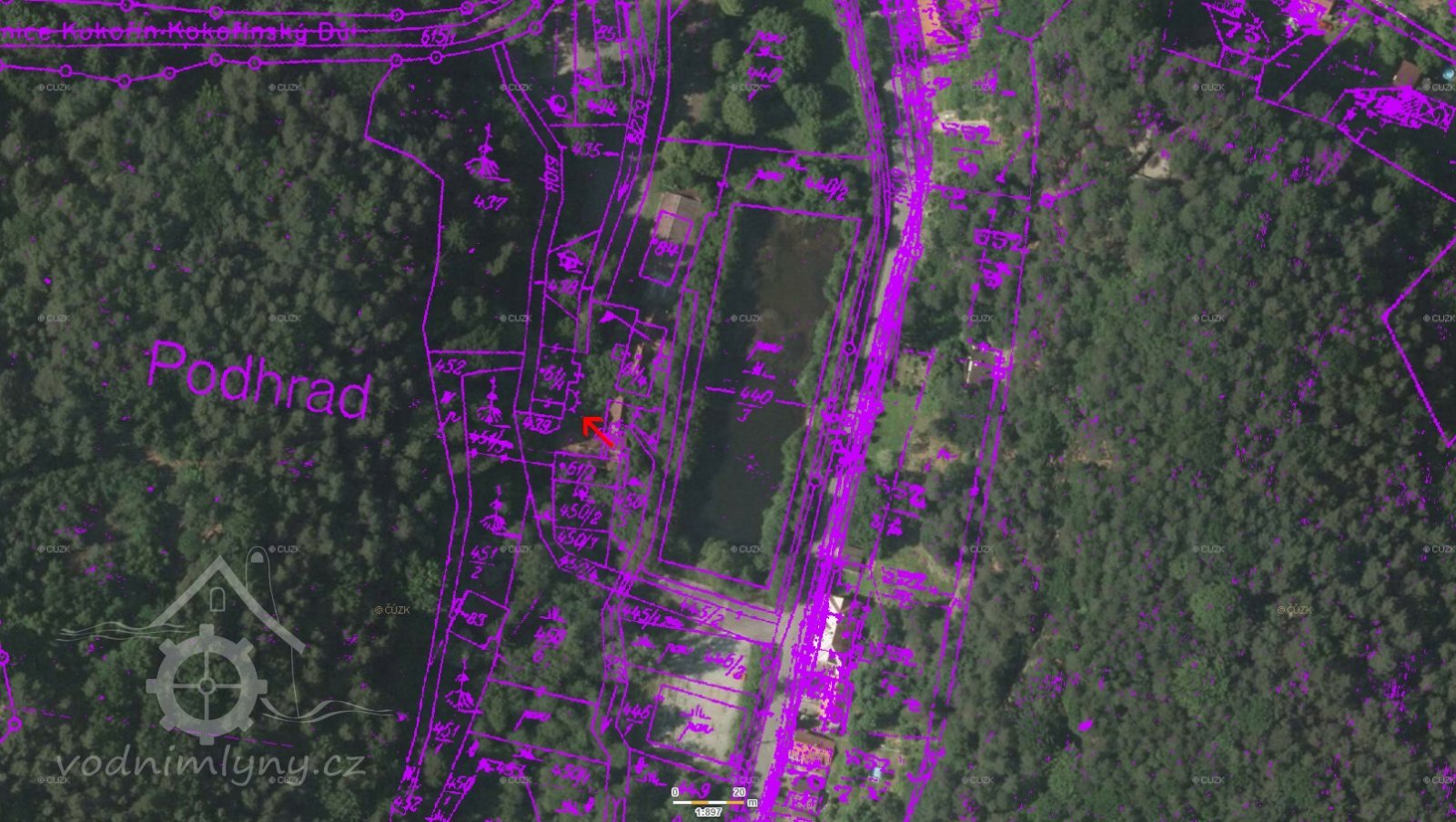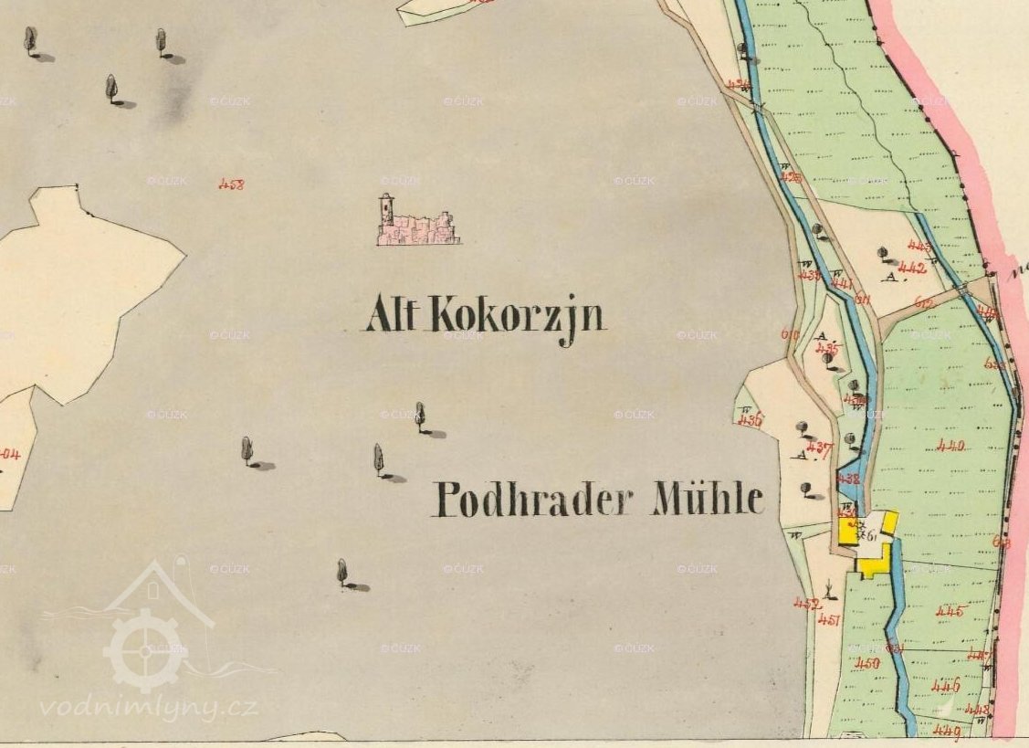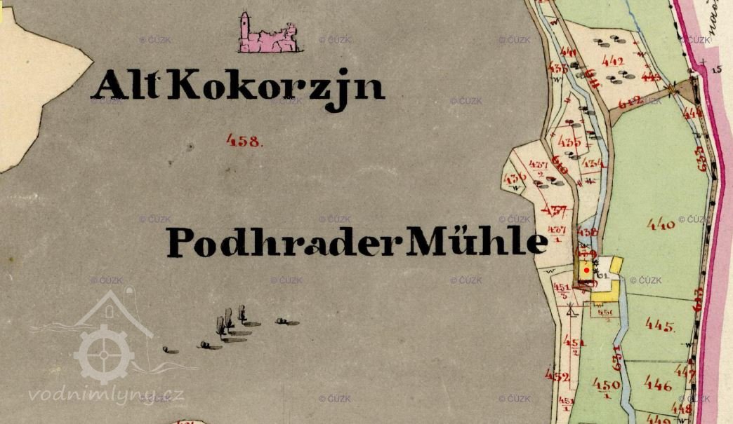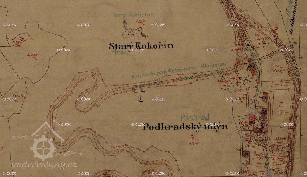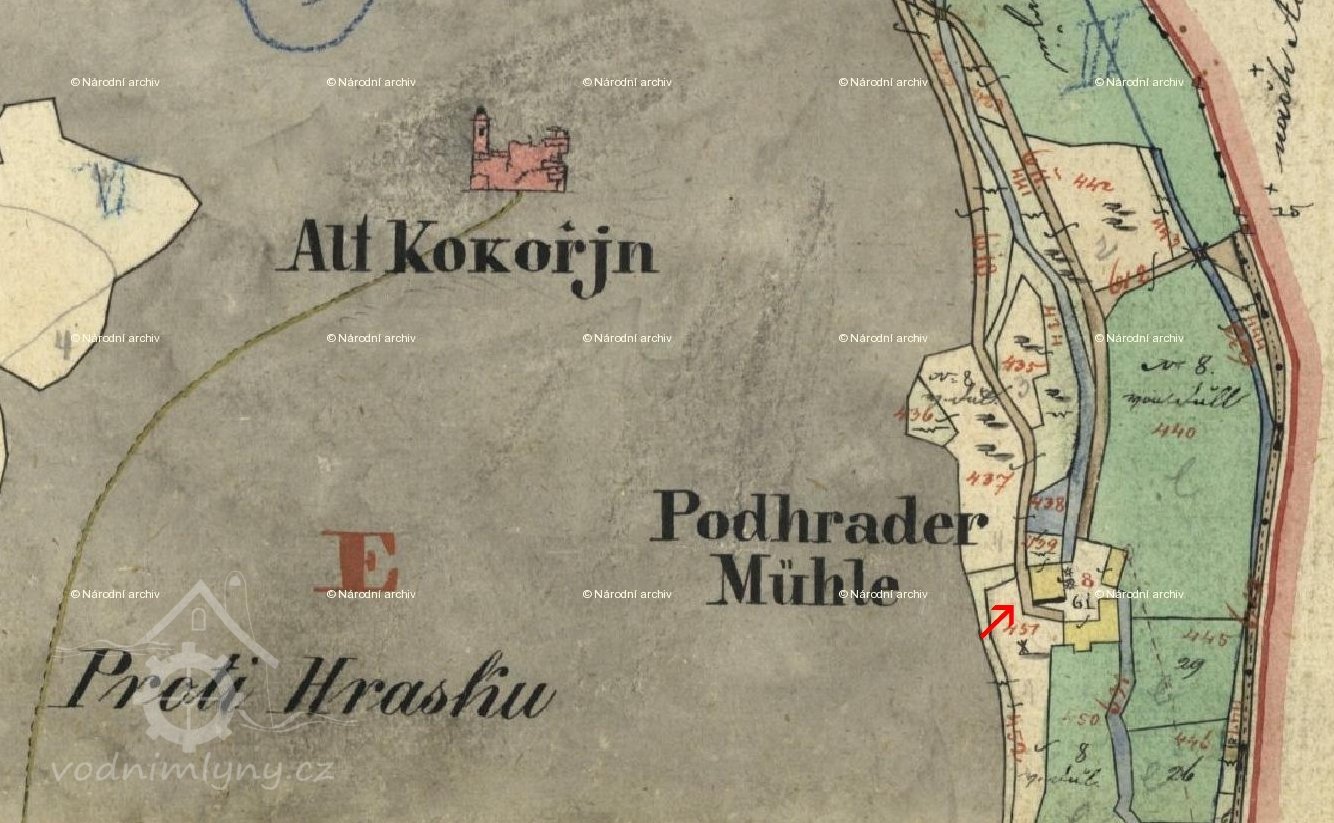 Potok Klokoč utvořený z 3 pramenů Vrutického, pod Hájkem a pramene Klokoč svěcený, kteréžto pra-meny se asi 1/4 hodiny nad mlýnem stékající a mlýn pohánějící. Podhradí čp. 9, mlýnek s jedním složením přímo na Krušeneckém potoce pokud by bylo více vody, než je třeba na kolo, rozlévá se do louky.