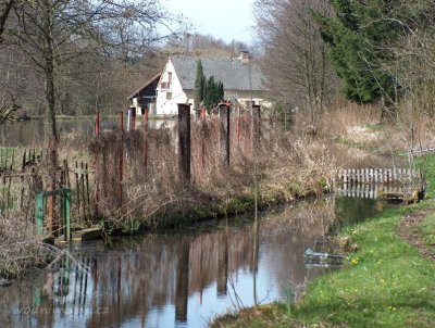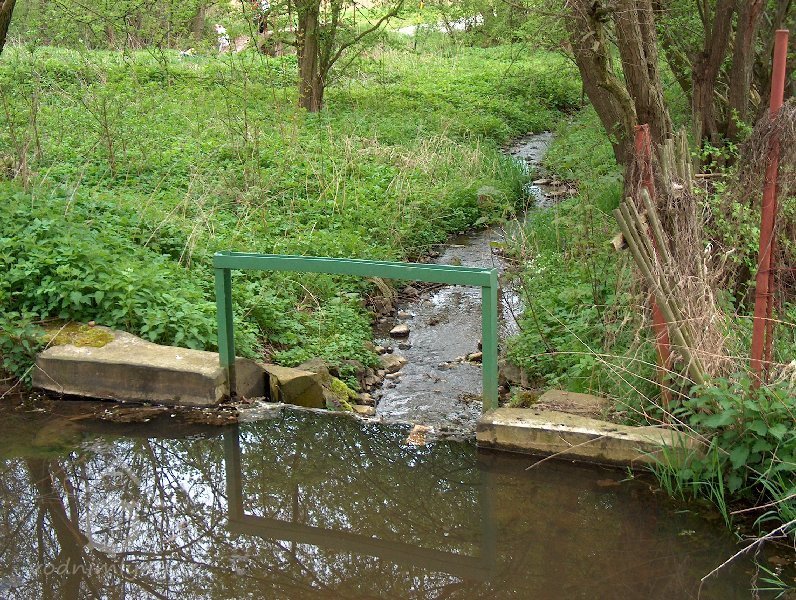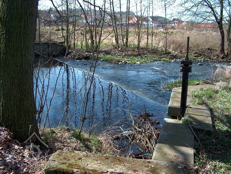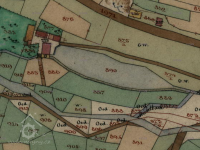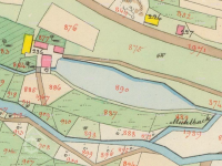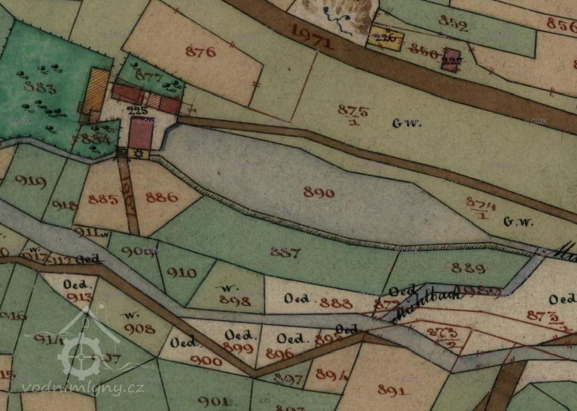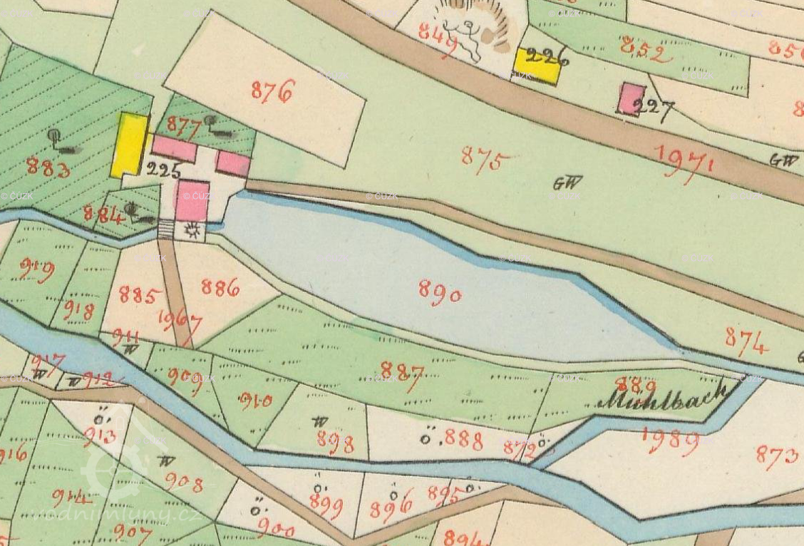 Nad mlýnem rybník, voda z něj přiváděna dřevěnými vantroky na kolo.