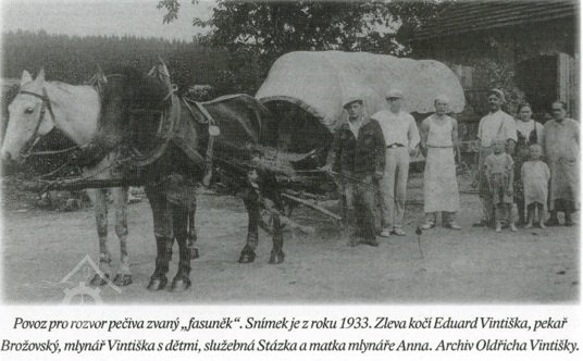 Výrobky z pečiva,  si mlynář rozvářel vlastním povozem. Měl 2 koně a tak zvaný „fasuněk“. Kočí byl zprvu najatý, ale v době krize tuto funkci vykonával mlynářův bratr Eduard. V roce 1935 mlynář koně výhodně prodal a kromě toho, že si za získané peníze koupil 2 krávy, pořídil si i osobní automobil NASH z USA. Přeříznutím karoserie jej předělal na nákladní vůz s nosností 1,2 tuny.