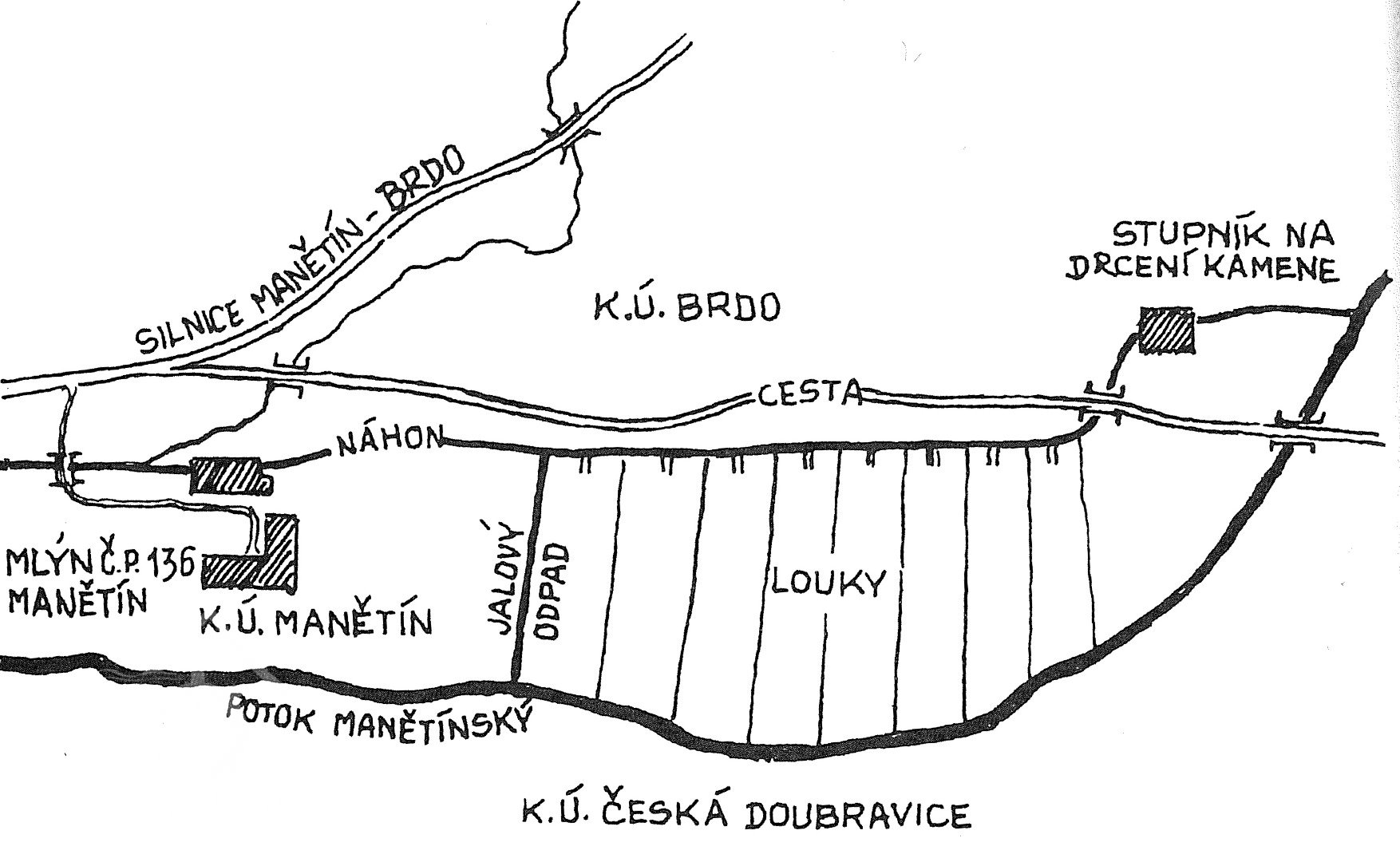 Na Manětínském potoce nad silničním potokem jez dlouhý 23 m, na počátku náhonu stavítko široké 1,32 m.