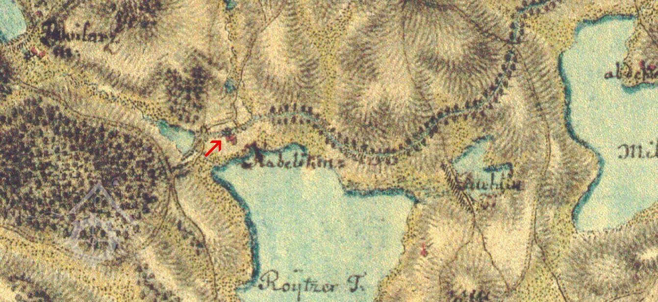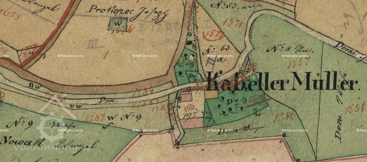 „(…) Nalezl jsem zkazku, dle níž na statku číslo domu 5, číslo domu 43 (mlýn) a na mlýně zvaném "Kabelík" (mlýn při hořejším cípu rybníka Velkorojického) byl stejný malovaný znak a dle níž tyto tři budovy byly náležely jednomu majiteli. Jaký tento znak byl, nemohl jsem se dopátrati."