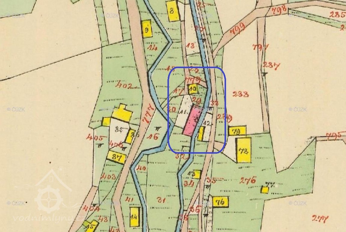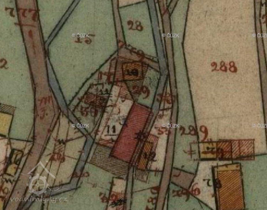 Stabilní katastr r. 1840: Bělidlo, mlýn, pila. Bělidlo patřilo k šolcově domu č.p.11.