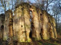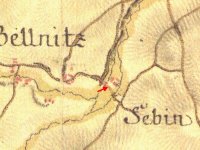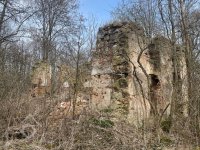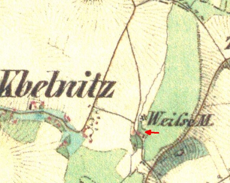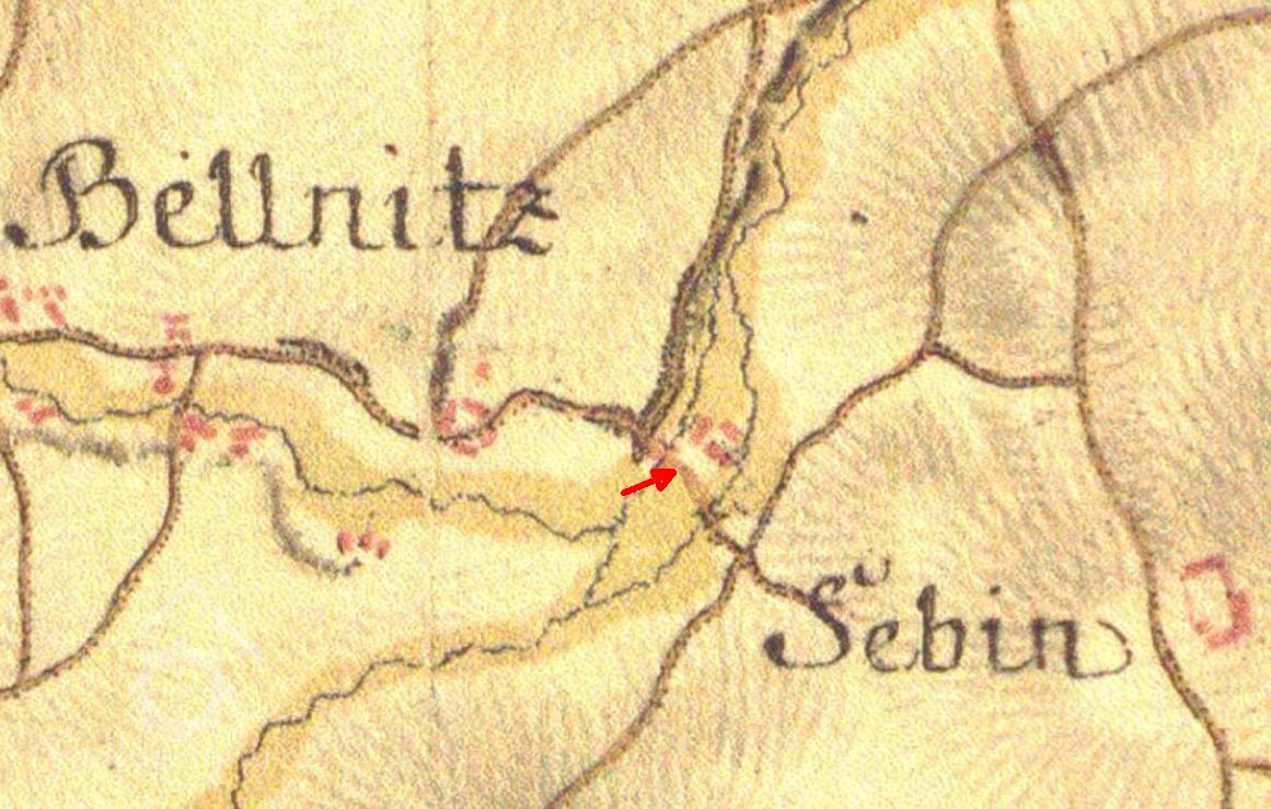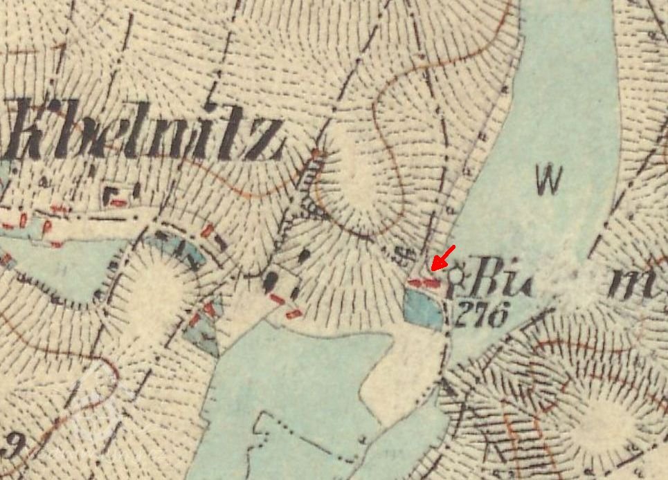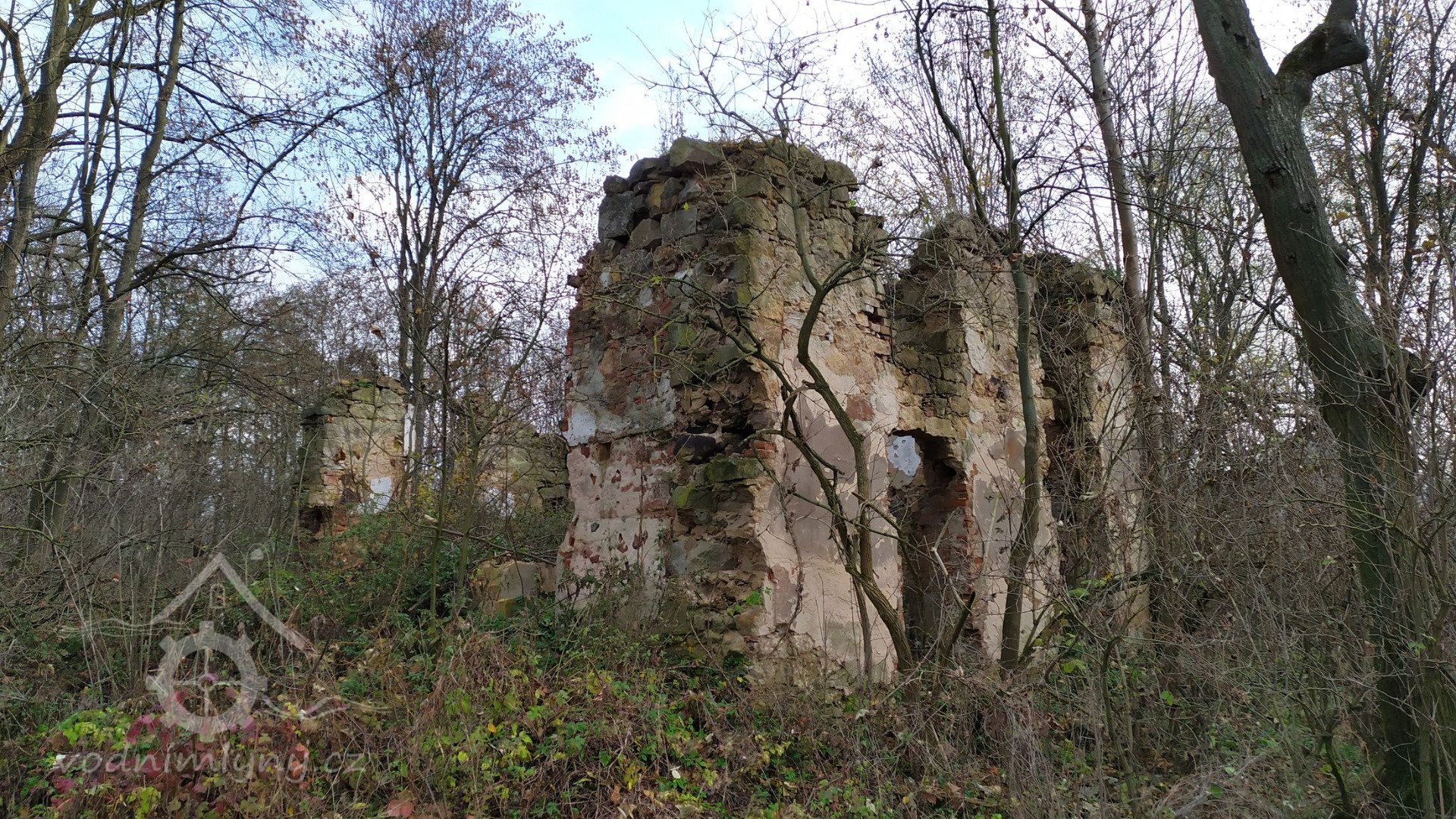 Zbytky mlýna stojí u křižovatky polních cest z Kbelnice, Sedliček a Jičína. Z mlýna zbyly obvodové zdi do výše 1. patra.