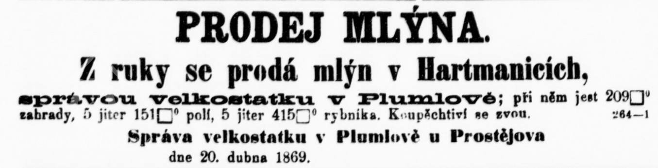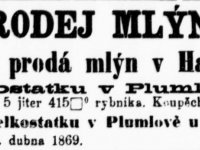 20.4.1869 prodej mlýna z majetku plumlovského panství