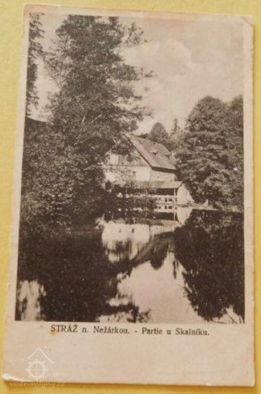 Urban Skalník ze mlejna od Skalníků matrikami doložen v r. 1671. Před r.1922 měl mlýn tři vodní kola. Následně byla nahrazena jedním vodním kolem na střední vodu. V r. 1933 byla zkolaudována turbína. Mlýn byl majetkem proslulé operní pěvkyně Emy Destinnové, zámecké paní ve Stráži.