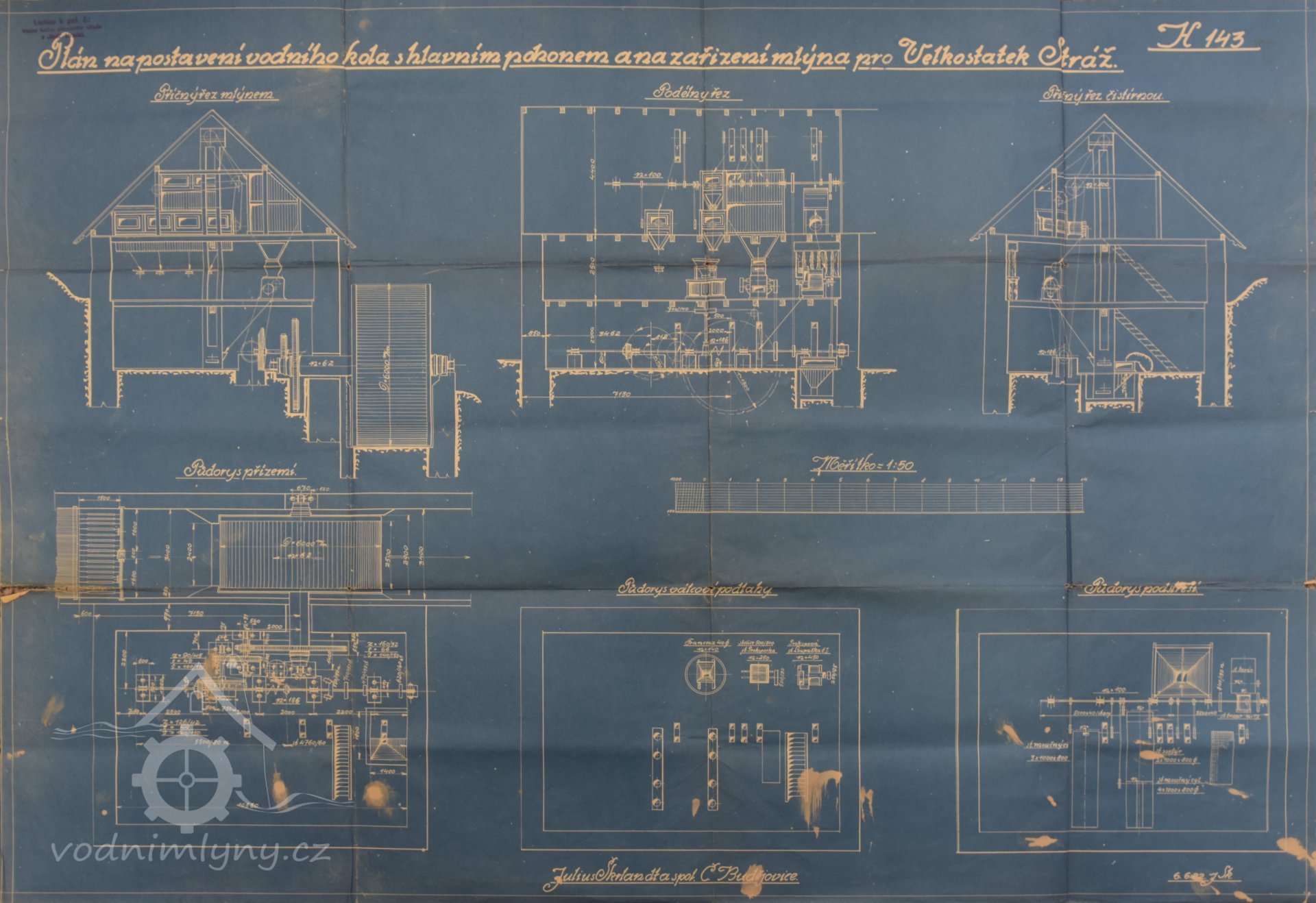Voda užívána ku hnaní mlýnských strojů, tři vodníkola, tři složení a stoupy. Dvě stavidla ½ sáhu 6“ široké, ½ sáhu 2“ vysoké, dva mlýnské žlaby 2´ vysoké ½ sáhu 6“ široké. Tři vodní kola 2 sáhy v průměru a ½ sáhu široké, průměr mlýnských kamenů 31 palců. Kola jsou na spodní vodu s dvěma dřevěnými věnci.