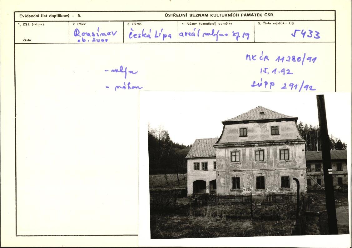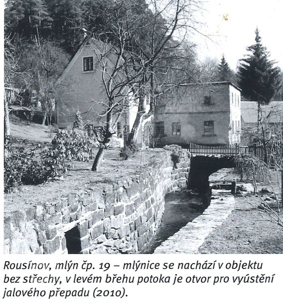 Areál vodního mlýna s dochovaným náhonem nalezneme ve střední části osady Rousínov. Nejstarší část budovy mlýna, nyní ve špatném stavebně technickém stavu, je datována rokem 1795, dvě mladší navazující křídla byla nedávno rekonstruována.