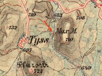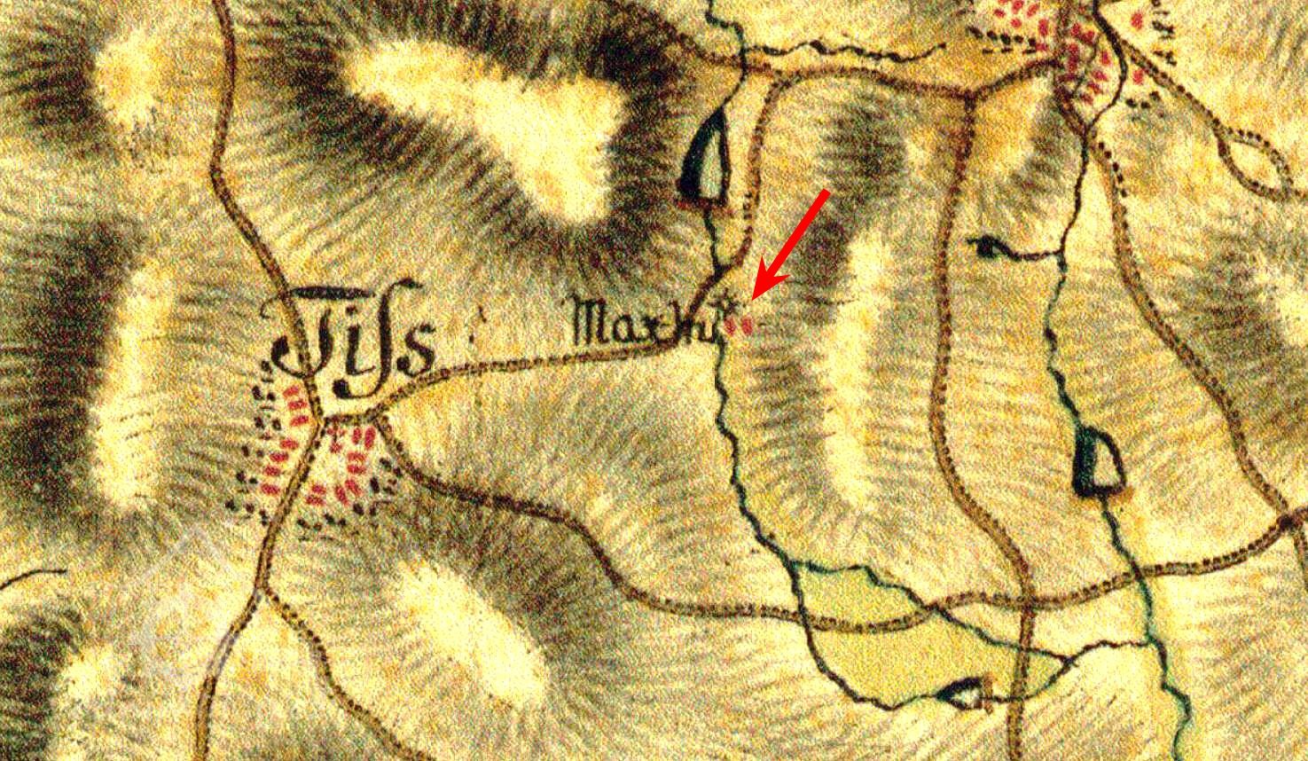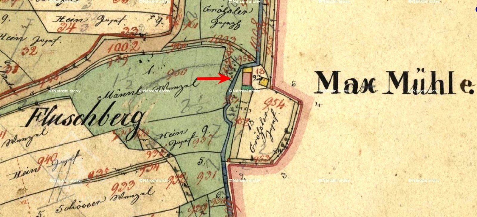 Na levém břehu Klein Giessbachu, známého pod novějším názvem Malá Trasovka zhruba 400 metrů na východ od dnes zaniklé obce Tis (Tiess), byl v druhé polovině 18. století vybudován mlýn Maxmühle. Budova vodního mlýna se poprvé objevuje na mapě 1. vojenského josefského mapování probíhajícího mezi lety 1764-1768. Vodní kolo, které bylo umístěné na severní straně budovy mlýna, poháněla voda potoka proudící náhonem z blízkého rybníka "En Teich".