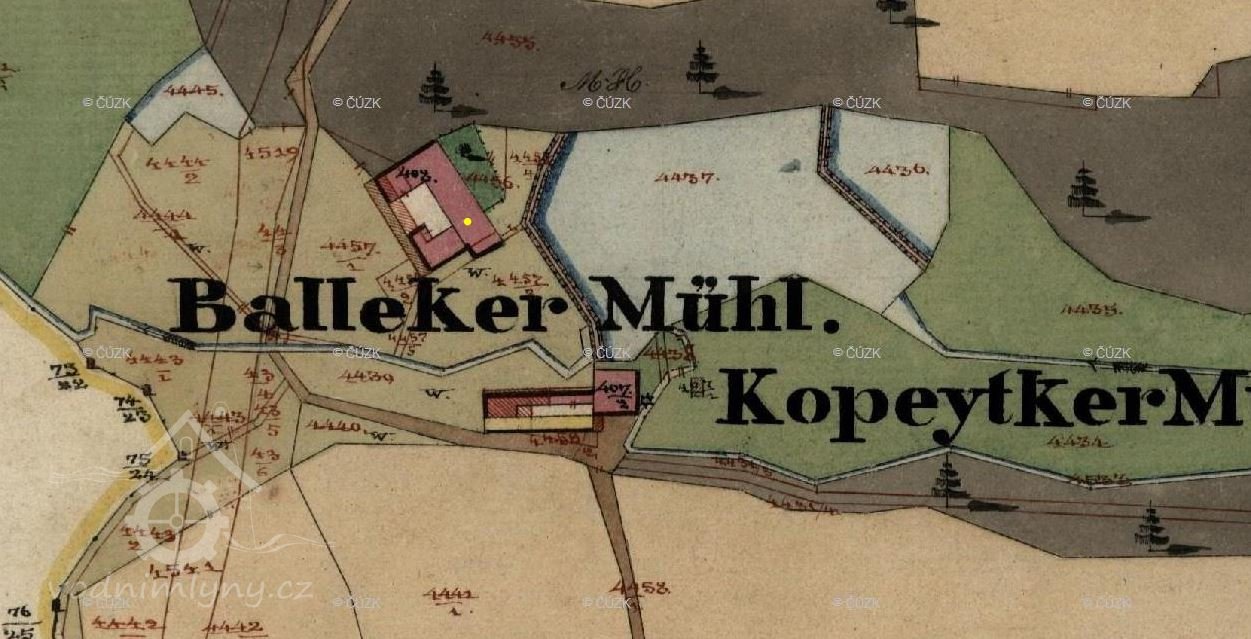 PopisPři zápisu do vodní knihy začátkem 70tých let 19. století měl tři vodní kola. V roce 1902 mlynář Raimund Balek žádá o provedení změn a to snížení počtu vodních kol na dvě. Jedno hnalo dvě válcové stolice s příslušenství. Druhé pak špičák na obilí a triér.