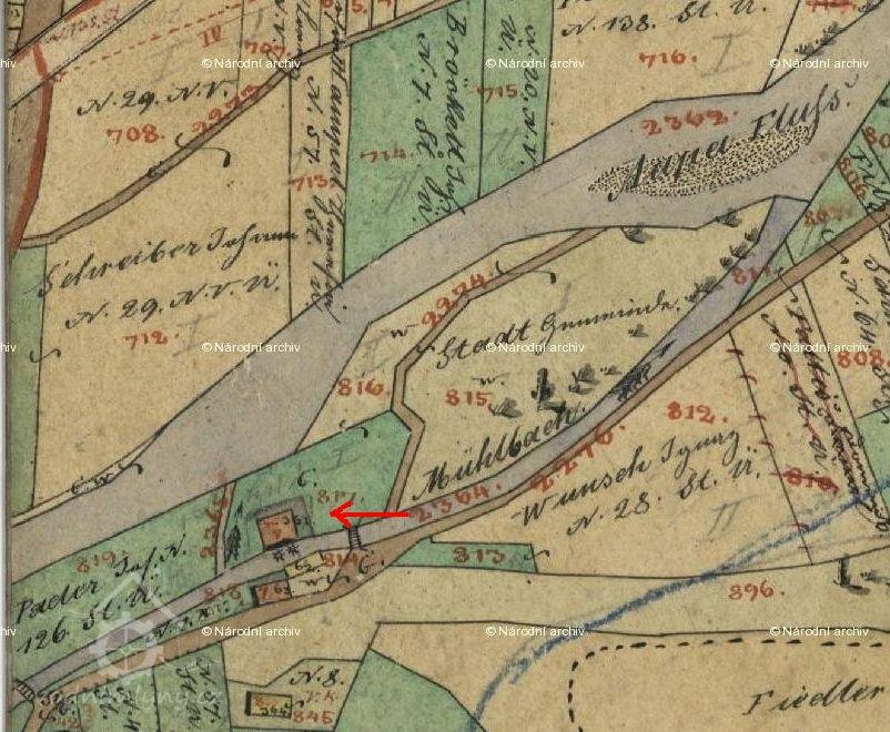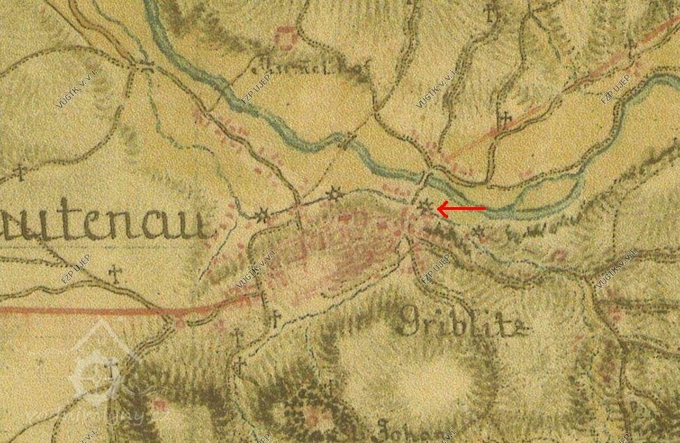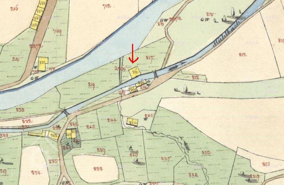 Na indikační skice z r. 1841 má čp. 7 a je postaven na pozemku č. 361. Severně je ohraničen řekou Úpou, jižně náhonem /Mühlbach/, ze západu ústím Kryblického potoka do řeky Úpy. Podle zobrazení na skice byl mlýn o dvou kolech. Na císařském otisku není u stavby na p.č.st. 361 mapová značka mlýna.