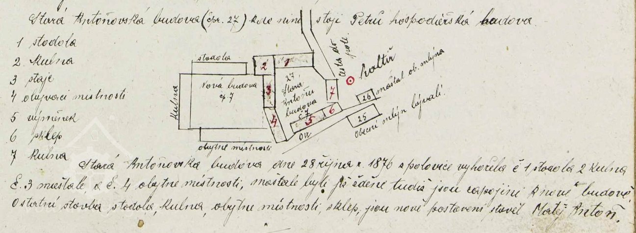 čp. 7 vyhořelo dne 28. října r. 1876, shořela stará došky kryta stodola, zděne stáje kryte tažky, staré obytné místnosti kryté došky, majitel Matěj Antoň budovu tuto na novém základním místě přestavěl, až na stáje, na které dal novou vazbu, výměnek skulnou neschořel.