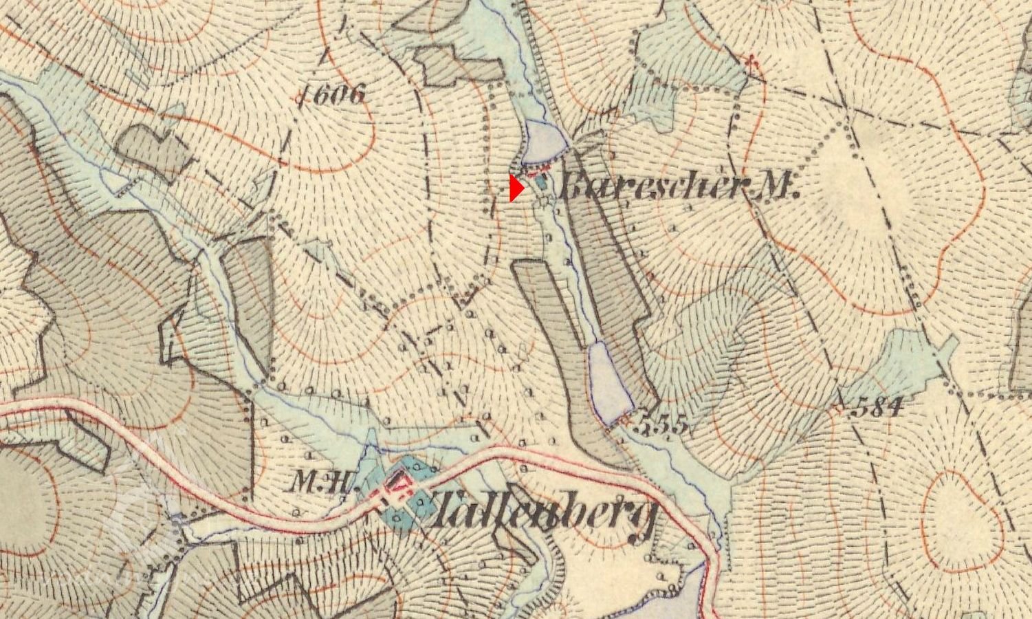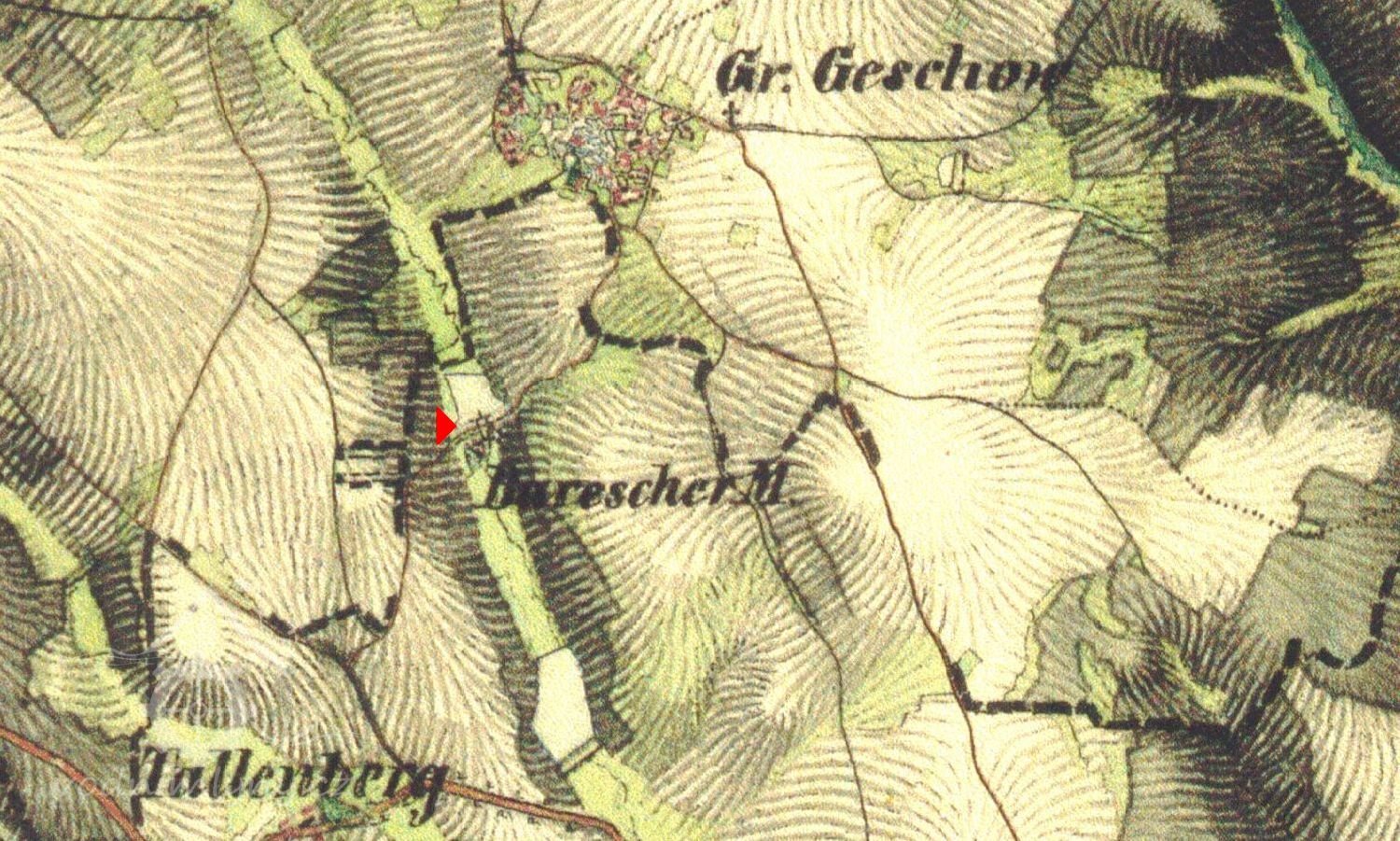 Při odbočení vlevo na vjezdu do obce Velký Ježov dojdeme po pár minutách na hráz zarostlého rybníka zvaného Bareš, který však na mapách nenajdeme. Vpravo pod hrází stál do ještě na přelomu 19. a 20. století mlýn, matrikami doložen o dvě stě let dříve. Mlýn zrušil poslední majitel panství Těchobuz.