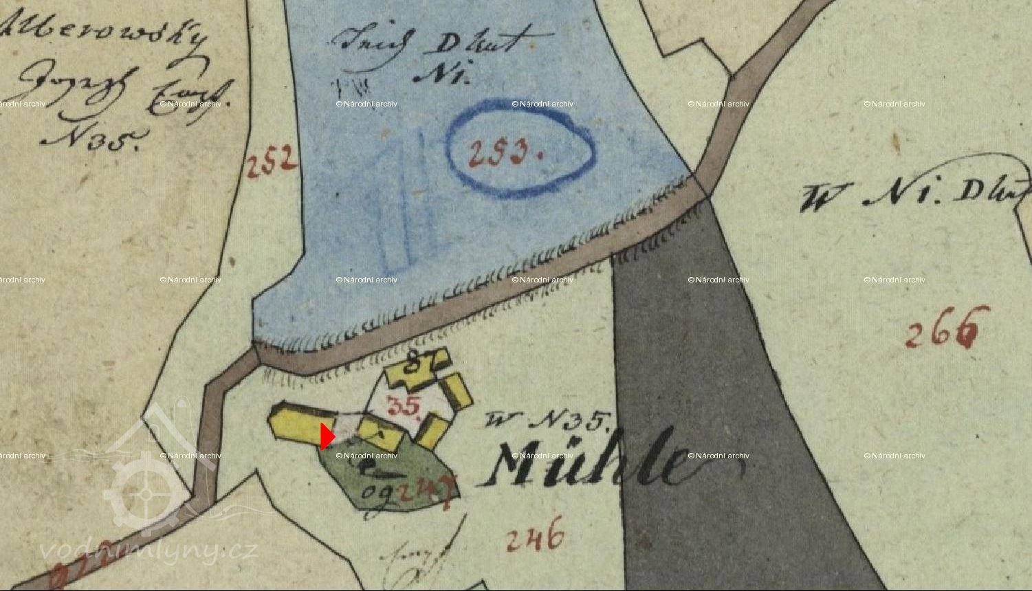 Z rybníka táhne se voda troubou do vantrok a z těch žlabem na vodní kolo. Stavítko u trouby této je 22 cm vysoké a 30 cm široké. Vantroky jsou široké 97 cm, dlouhé 2,7 m a 94 cm hluboké; stavítko v nich je 37 cm vysoké a 29 cm široké; žlab je 29 cm široký a 18 cm hluboký.