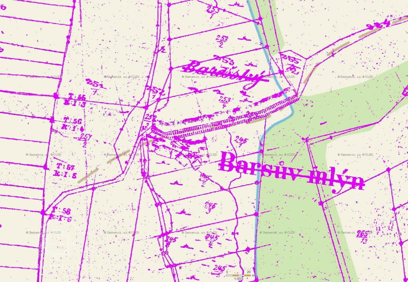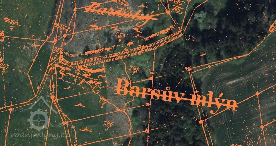 Obec a osada: Těchobuz na rybníku tzv. „Bareš“ leží mlýn čp.35 a stoupy; tzv. Baršův mlýn