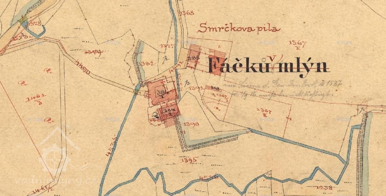 Mlýn Fáčkúv má původ velmi starý, je totiž zapsán již kolem roku 1562 jako mlýn Turkův u nového obecního rybníka Šťastnovského, zřízeného na louce Pijavičníku a darovaného před tím obci roku 1559 Jáchymem z Hradce. Rod Fáčků tu mlynařil po dvě staletí. V pozdější době r. 1880 došlo k přestavbě objektu na sídlo Ladislavem Brdíkem. Objekt byl posléze přestavěn i na pilu a továrnu na pletené zboží (firma V. J. Smrčky). Firma Viléma Smrčky byla po II. světové válce zkonfiskována. Po roce 1950 do sídla se vzácným interiérem (štuky, fresky, mozaiky, krby, výtvarně pojaté prvky, mozaikové parkety atd.) přikazoval místní národní výbor nájemníky - dělníky z blízkého státního statku, kteří nebyli místní, nebyli zvyklí na obvyklý stupeň civilizace a svým způsobem užívání cenný dům zničili. Dům sice zůstal majetkem manželů Smrčkových, kteří zde nadále bydleli, ale MNV měl právo na „nadbytečné metry" jejich bydlení a proto mohl přikazovat byty dalším nájemcům.