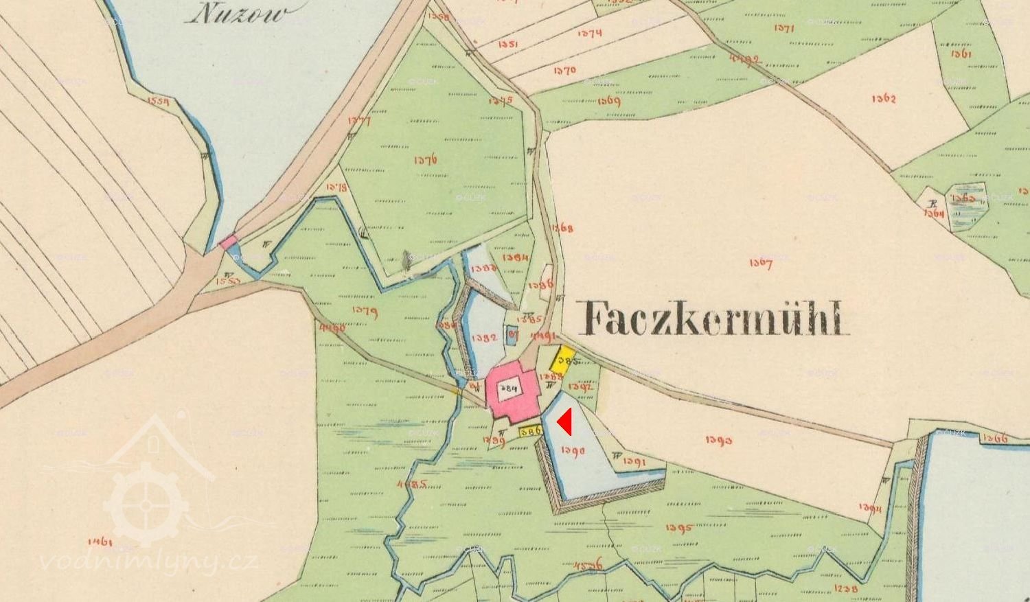 Voda přicházela ke mlýnu z rybníka Nůzov (Nuzov). V hrázi byla roura o světlosti 0,75m šiřky a 0,55m výšky a voda šla pak mlýnským náhonem na vantroky a dále pak na kola v lednici.