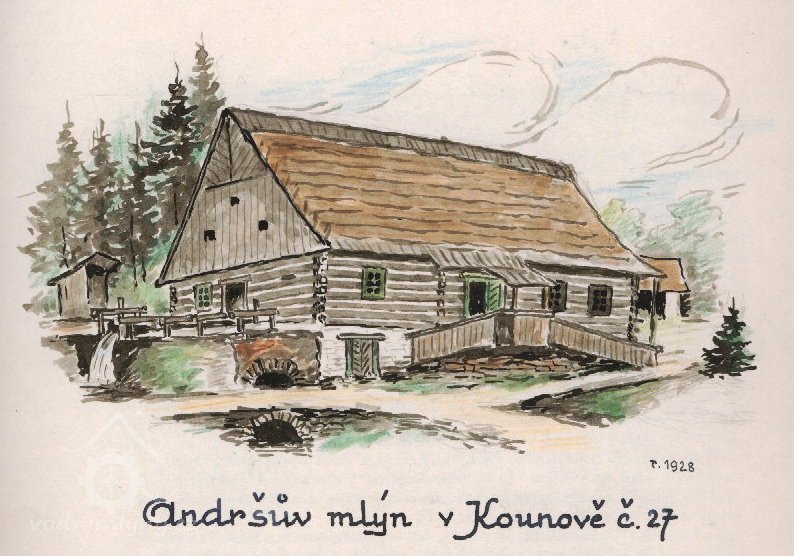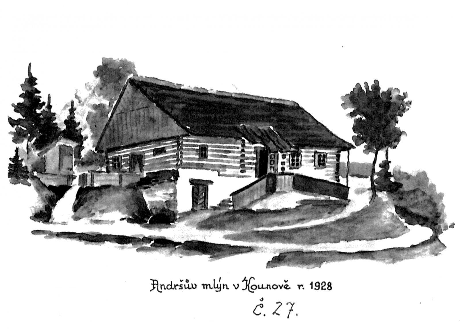 1) Podle pověsti mlýn založil na konci 30. leté války švédský zběh jménem Andreas, který se v Kounově usadil a oženil s dcerou ze statku. Časem tak zbohatl, že svým čtyřem synům mohl odkázat čtyři statky - čp. 27, 28, 29 a 52. (Ve skutečnosti mlýn zdaleka tak starý není.)