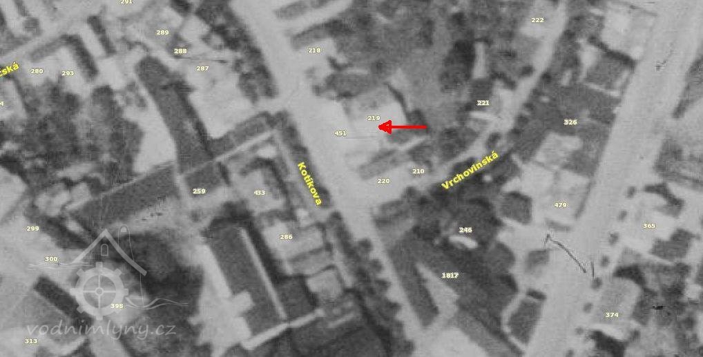 Mlýn o dvou kolech ze 17. stol. Roku 1897 zbořen a na jeho místě postaven velkomlýn. Mlýnská činnost v něm byla zastavena r. 1926 a budova byla upravena na úřadovnu nemocenské pokladny, ordinace a parní a vanové lázně.