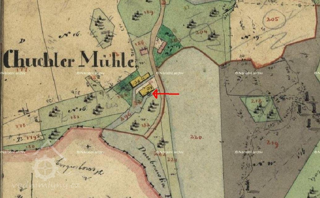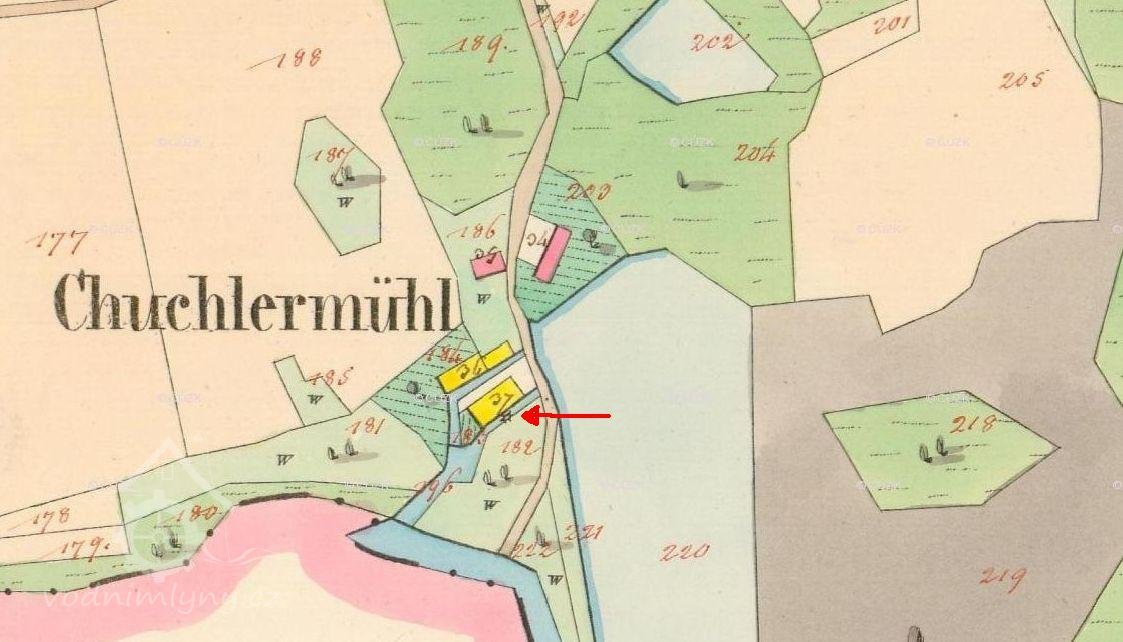 Malý venkovský mlýn s pilou na náhonu z řeky Doubravy u Mlýnského rybníka v Chuchli čp. 16 na st.p. 37. Mlýn je dnes v katastru označen jako zemědělská stavba bez čp.