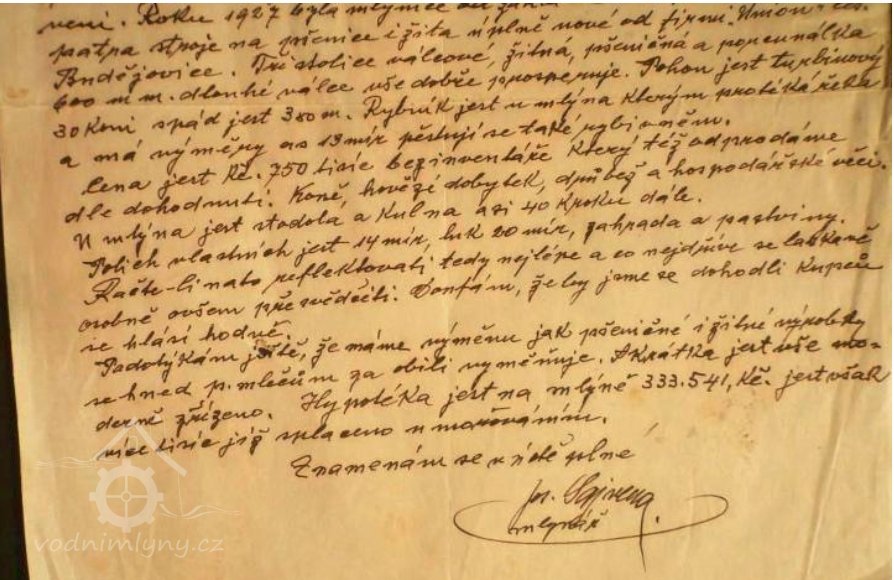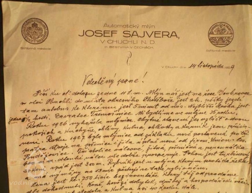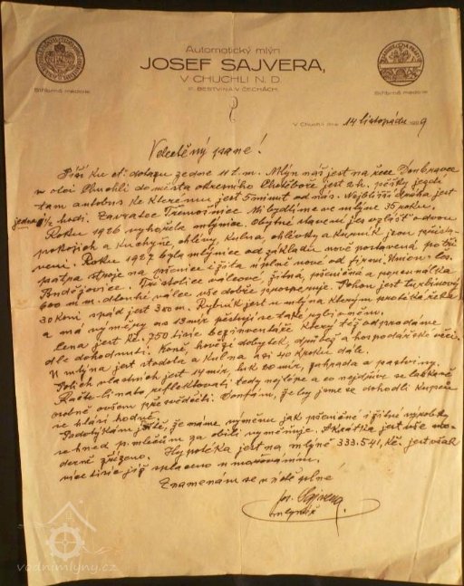 Josef Sajvera píše dopis zájemci o mlýn (1929) viz ikonografie. (RŠ)