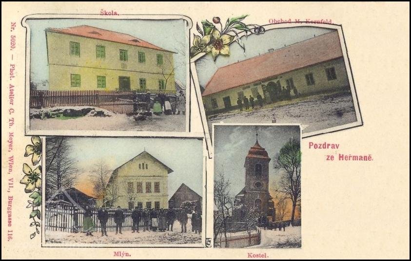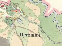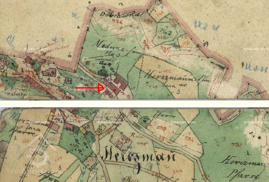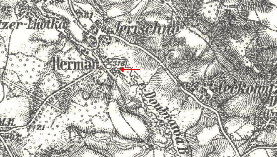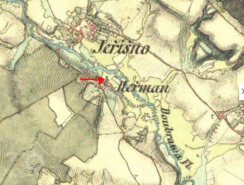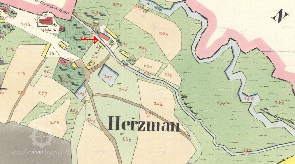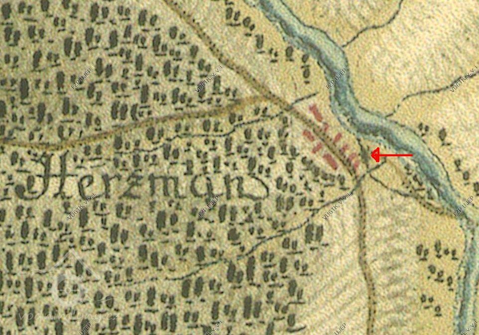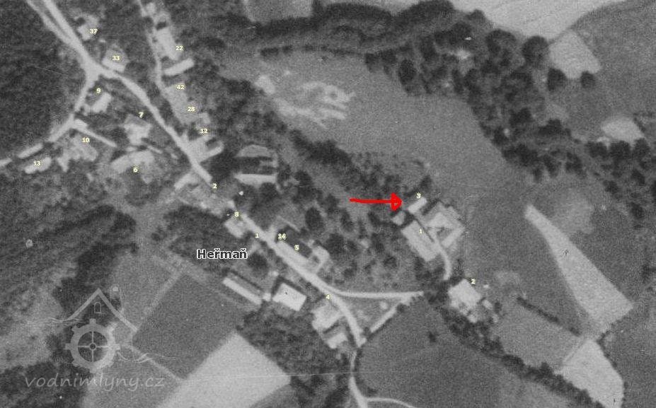 Mlýn v Heřmani na náhonu z řeky Doubravy je zakreslen již při I. vojenském mapování v letech 1764-68. Císařský povinný otisk z r. 1838 uvádí tento objekt na stav. pozemku č. 27 a 28 bez mapové značky mlýna, indikační skica informuje o čp. 3. Také na II. vojenské mapě z let 1836-52 je mlýn v Heřmani zakreslen.
