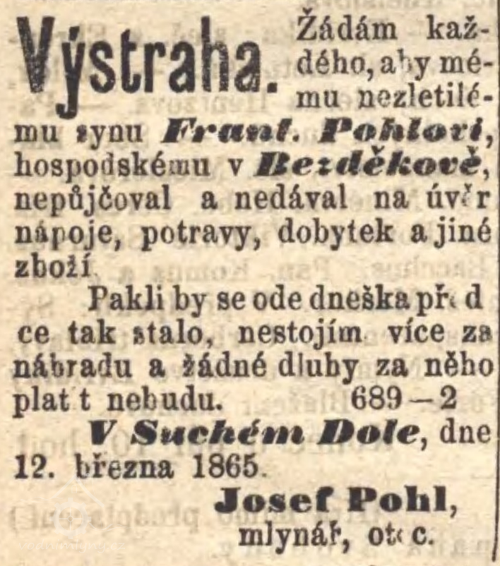 Mlýn odkázal svému synovi Josefu Pohlovi /takto změněné jméno se uvádí i nadále/ a jeho manželce Veronice za 500 kop míšeňských.