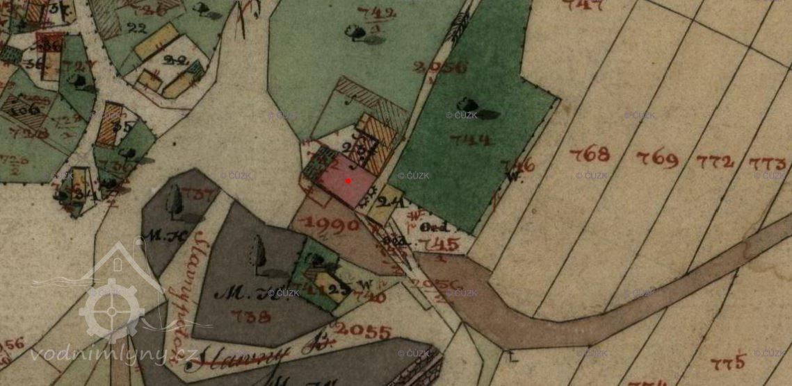 "Vody využíváno k provozování mlynářské živnosti a řezání dřeva. Čtyři vodní kola pohání 3 mlýnská složení, stoupy a pilu. Právo na využívání vody omezeno. Tři vodní kola v průměru 12´ a 3" a 29" šířku, kolo na pilu 12´a 3" v průměru a 41" široké. Průměr mlýnských kamenůl 32". Vodní kola dřevěná, dvouvěncové na svrchní vodu."