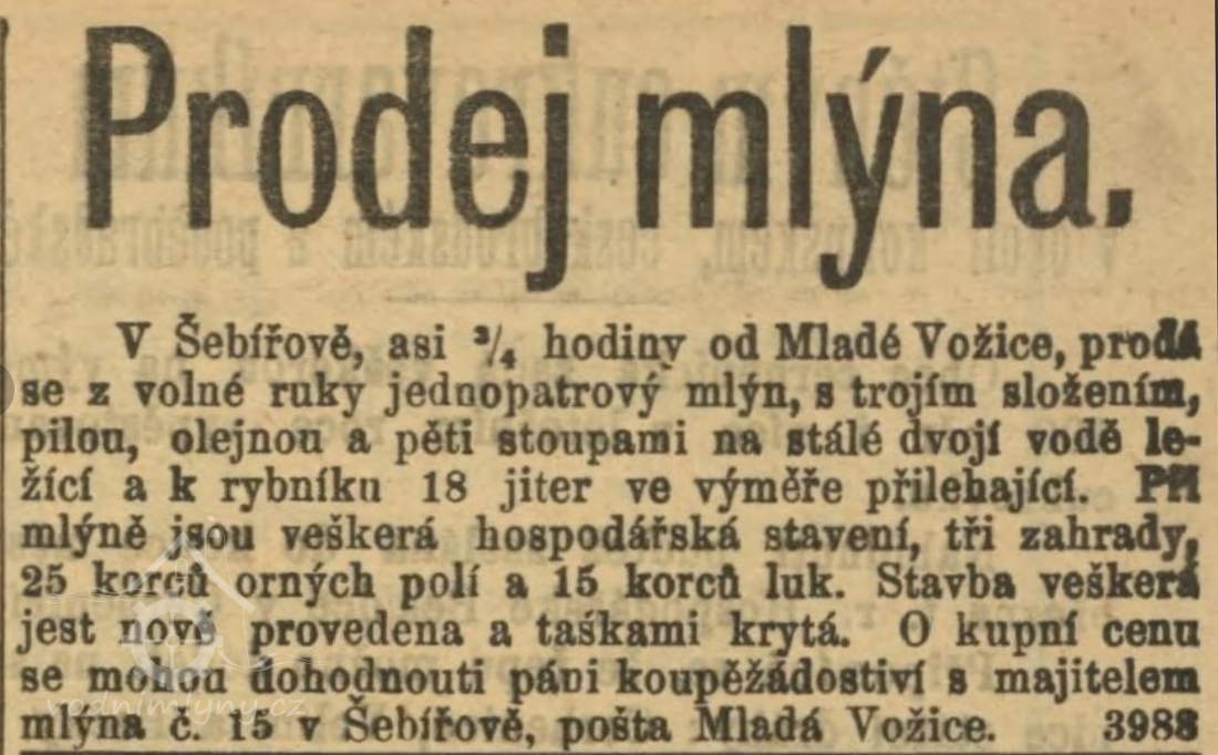 Jméno majitele mlýna a bydliště: Zahradník Josef, Šebířov 15, p. Ml.Vožice