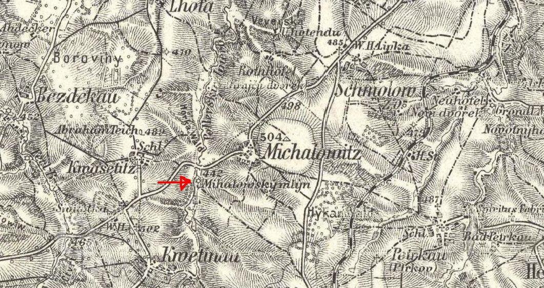 Michalovský mlýn doložen matrikami fary Krásná Hora 29.3.1676 - mlynář Krupka(?)