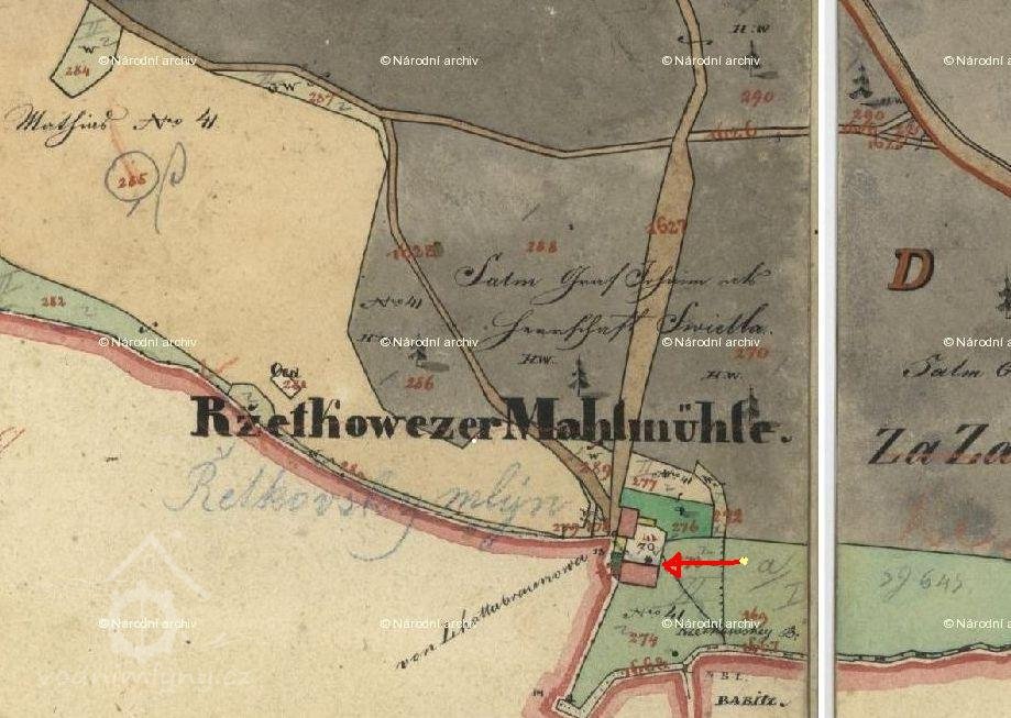 Ředkovský mlýn zaznamenán již na I. vojenské mapě v letech 1764-68.