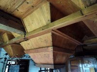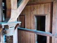 Stropy jsou trámové záklopové, zejména v přízemí poměrně komplikované z důvodu postupného zesilování o nové trámy, trámky a fošny z důvodu osazování dalších strojů (základem jsou masivní příčně kladené trámy a podélný průvlak). Někde jsou průvlaky podepřené dřevěnými sloupy s bačkorami. Roubené stěny jsou obílené vápnem.