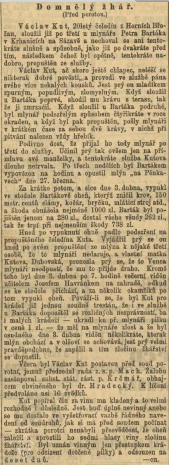 1883 vyhořela stodola, zapálil údajně ze msty Václav Dubovský (Novinový článek uvádí rok 1885, podezřelý byl čeledín Václav Kut - RR).