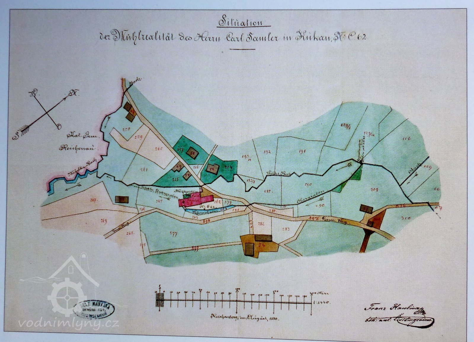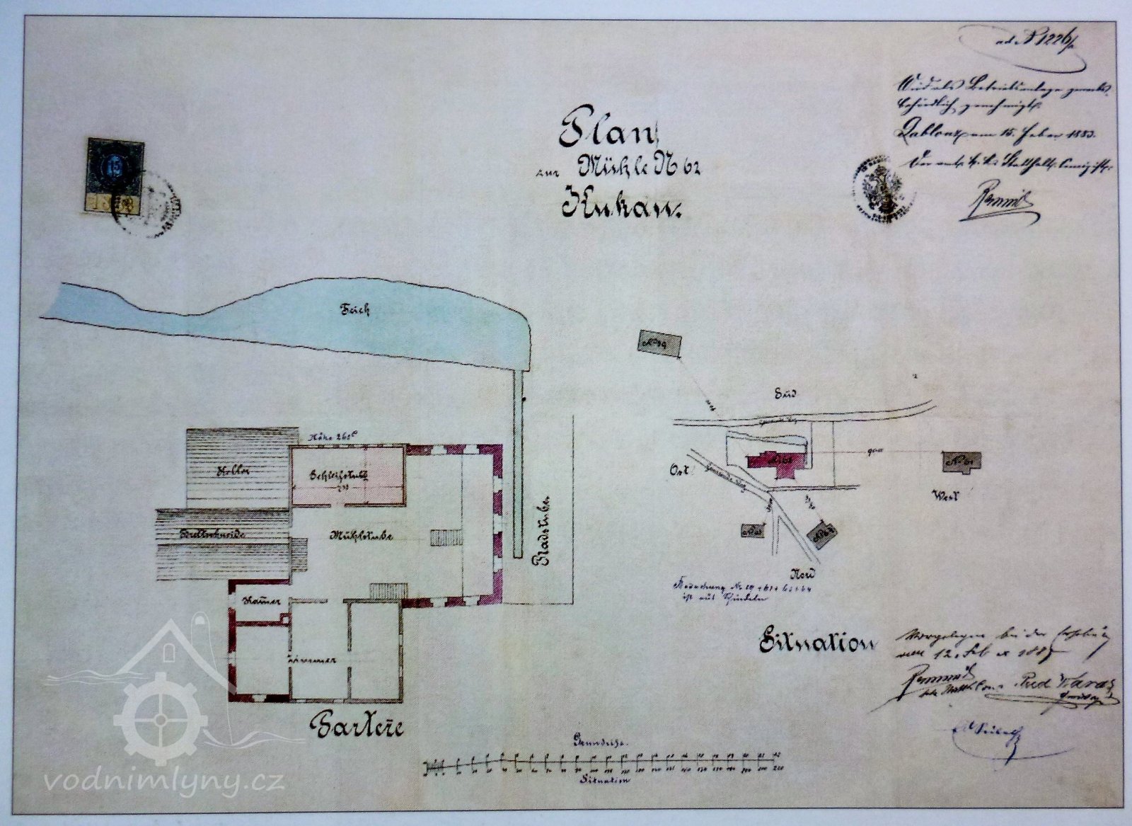 Popis1880: 2 kola na svrchní vodu, prům. 5,96 m, výkon 3 HP pro mlecí a špicovací zařízení, 3. kolo prům. 5,14 m a výkon 3 HP pro pohon pily.