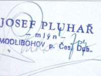 Josef Pluhař mladší převzal živnost od matky dne 9 dubna 1916 a vstoupil do Společenstva mlynářů. Manželka Anežka Müllerová, dc. domkáře z Kněžiček.