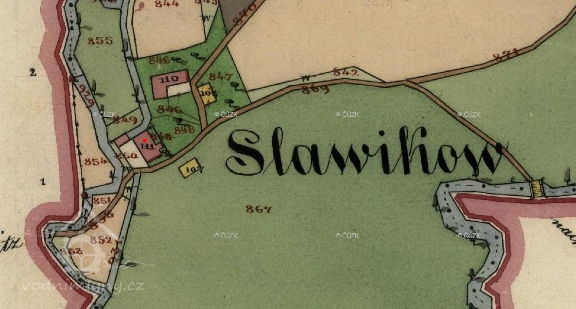 9.1.1930 Popis vodního díla: Pevný jez je ve špatném stavu z kamenné rovnaniny bez poevné koruny pouze z násypu a drnu v délce 10 m na potoce Oharce v osadě Slavíkov. Pravý břeh jest v katastru obce Chvalčovice, levý v katastru obce Radostín. Náhonem voda se voda na mlýn čp. 32 ve Slavíkově, odpad se zaúsťuje do potoka Oharky. Fixní bod osazen 1876 ve vzdálenosti 7,7 m od pravého sloupku vpouštěcího stavítka do náhonu a ve vzdálenosti 3 m od pravého břehu náhonu.