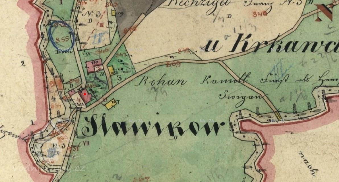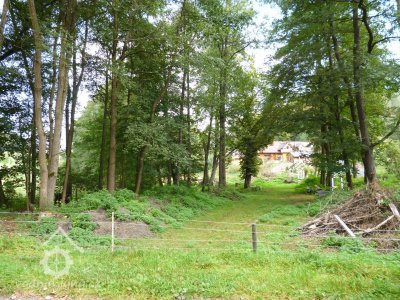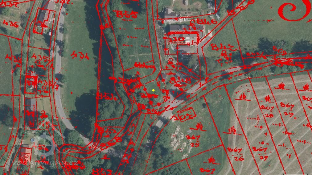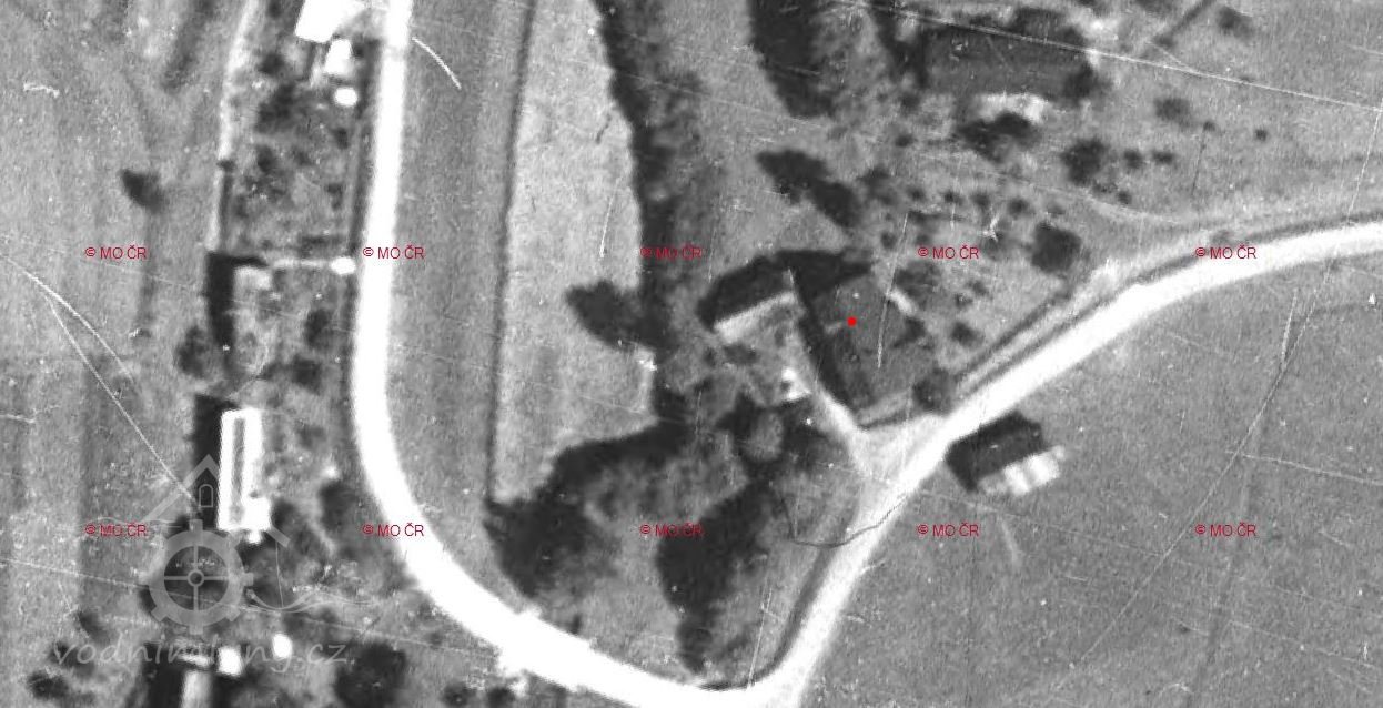 Neexistuje. Pozemek je oplocený, neudržovaný, rostou na něm vzrostlé stromy.