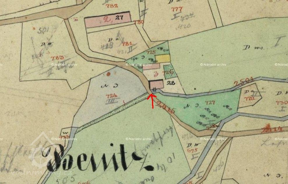 Na katastru nemovitostí má bývalý mlýn a další budovy, k němu přiléhající, společné číslo popisné. Budova mlýna p.č.st.28/1 je ve zchátralém stavu a zatím na ní byla prováděna zřejmě jen nejnutnější údržba.