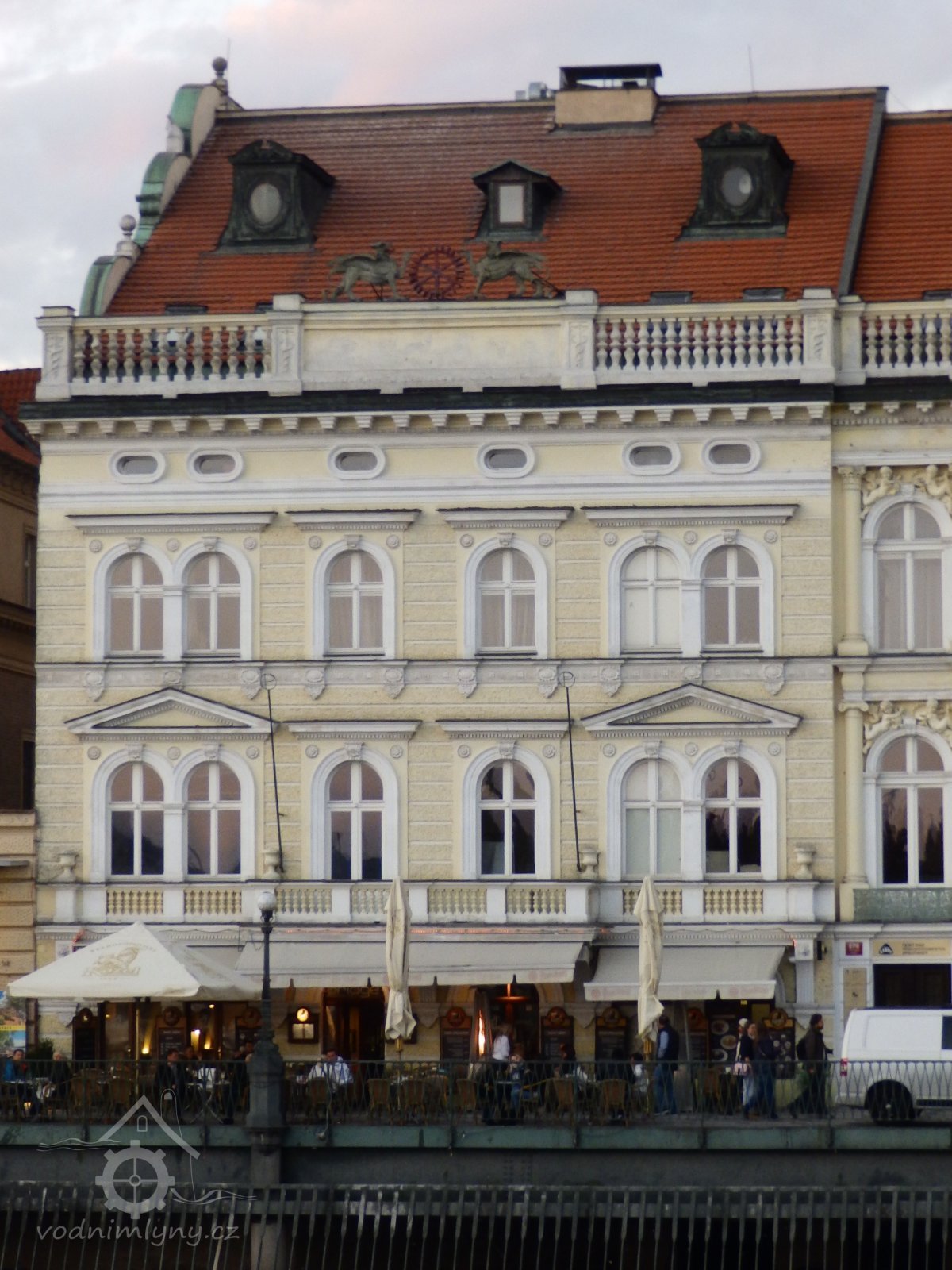 Bývalý mlýn je rozsáhlá čtyřkřídlá budova, křídly uzavírající vnitřní prostor lednice. Do Novotného lávky je dum obrácen dvoupatrovou fasádou s atikou o šesti osách, ke Karlovu mostu třípatrovou o pěti osách. Fasáda do Novotného lávky má honosné pusobení. V přízemí je na třetí ose půlkruhově zakončený vstup, stejně jsou ukončena i ostatní okna. Patra jsou oddělena průběžnými podokenními římsami, v prvním patře probíhá balustrový vlys. V parapetech oken druhého patra jsou konzolky. Okna mají půlkruhové záklenky, jsou rámována archivoltou na pilastrech. Krajní dvě osy obou pater jsou sdružené, v 1. patře spojeny společným trojúhelným tympanonem, ve druhém patře přímou nadokenní římsou. Nad druhým patrem je vložené polopatro s ležatě oválnými okénky, nad ním se zdvihá balustrová atika, ve středu s plným zdivem. Na něm stojí dva bronzoví gryfové, opírající se o ozubené kolo. Ze sedlové střechy vybíhají dva vikýře s oválným okénkem. Severní fasáda je ukončena trojdílným štítem se segmentovým tympanonem. Po levé straně vstupní chodby se zachovala tři pole křížové klenby, pozůstatky bývalého barokního mlýna.