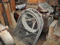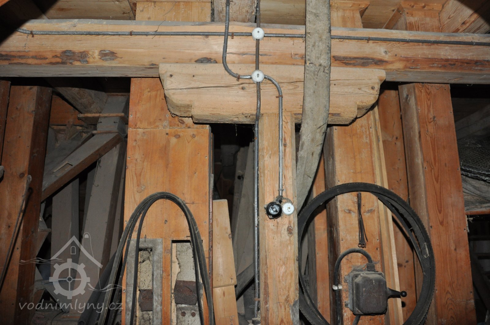 rolny lomící osu řemenu z horizontální transmise na vertikální k pohonu kamenného složení, 2015, © David Veverka, (Prvky na obrázku: transmise, řemenice, převody)