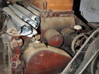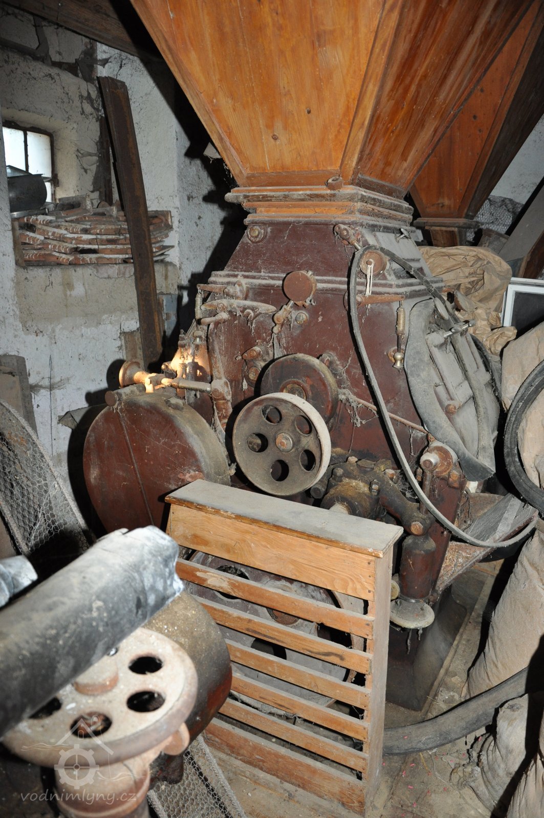 válcová stolice tuplovka výrobce Hugo Greffenius - Frankfurt nad Mohanem (vzácné), 2015, © David Veverka, (Prvky na obrázku: válcová stolice, zásobník, násypka)