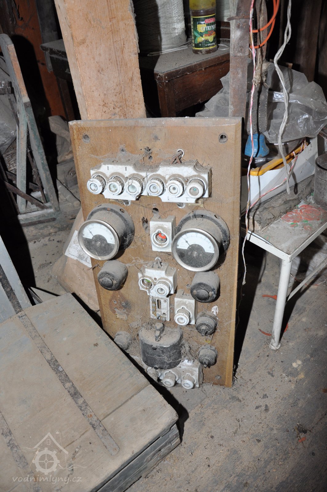 původní elektrické rozvody z 20. a 30. let 20. stol., 2015, © David Veverka, (Prvky na obrázku: elektrická rozvodná deska, výroba elektrické energie)