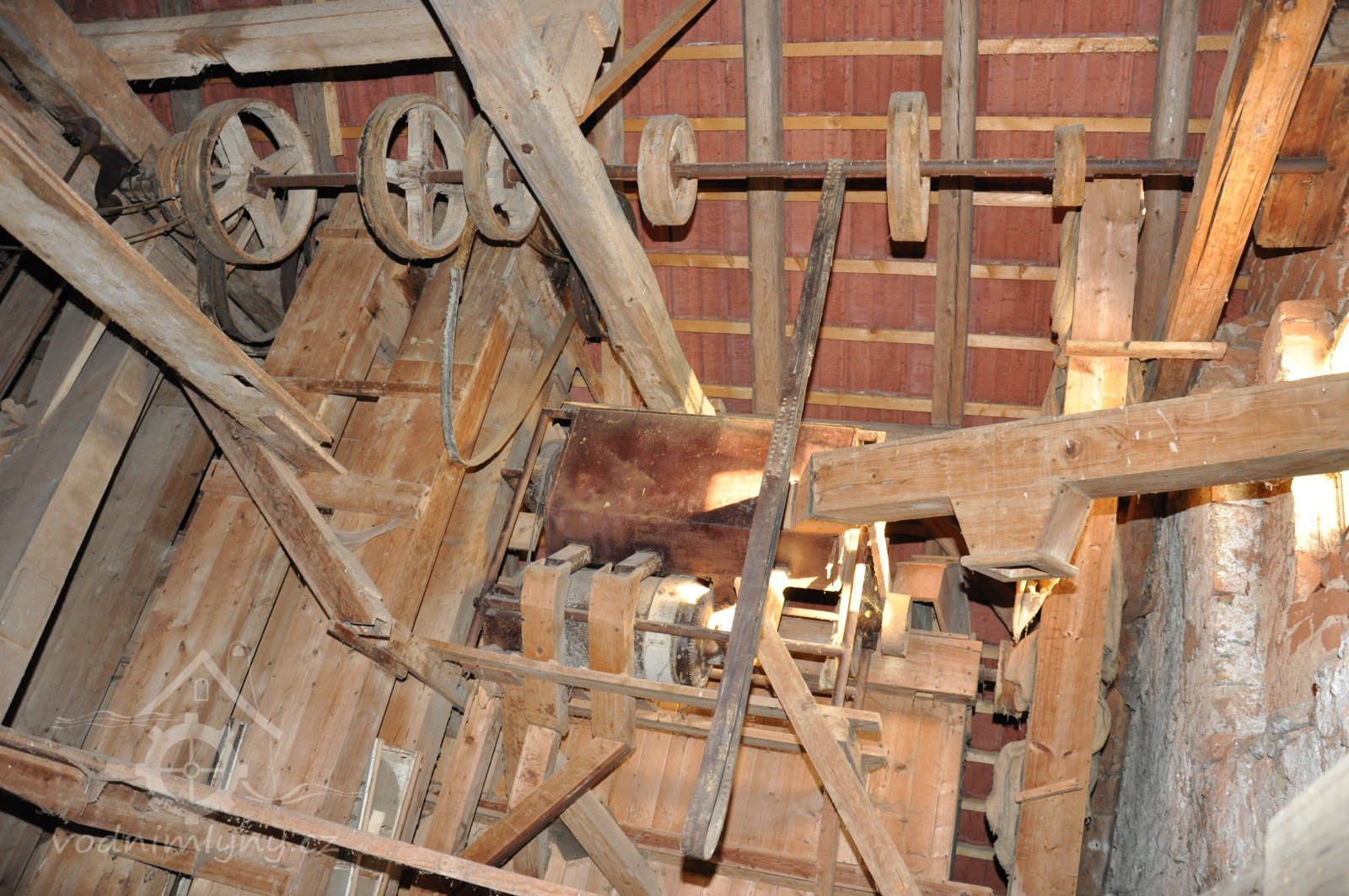hlavní transmise - detail dřevěné řemenice, 2015, © David Veverka, (Prvky na obrázku: transmise, řemenice, převody)