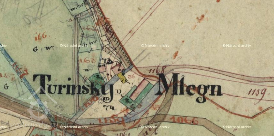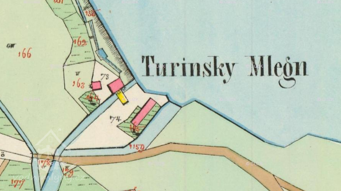 Mlýn pod hrází Turyňského rybníka, zrušeného v polovině XIX. století, ovšem po roce 1949 opět samovolně vzniklého na propadlém poddolovaném území. Dnes je největším rybníkem na Kladensku (51 ha). Vlastní mlýnice na pravém břehu náhonu po pol. 20. stol. zbořena, zachován pouze obytný a hospodářský trakt. Dnes u mlýna restaurace.