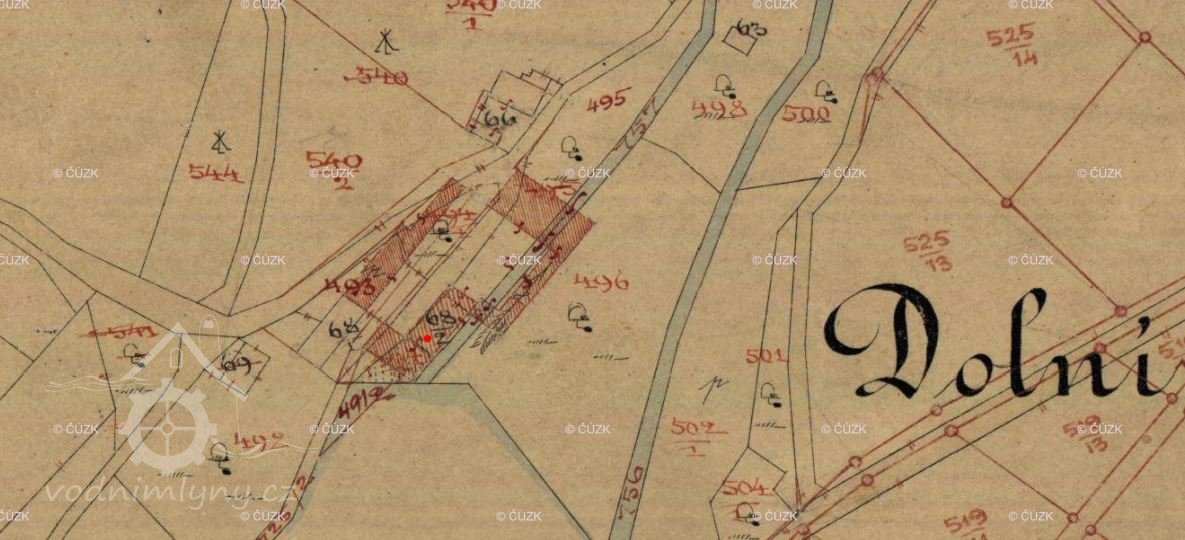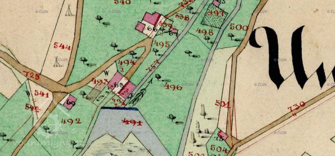 Popis1930: 1 kolo na svrchní vodu, hltnost 0,08 m3/s, spád 8,16 m, výkon 2,12 HP