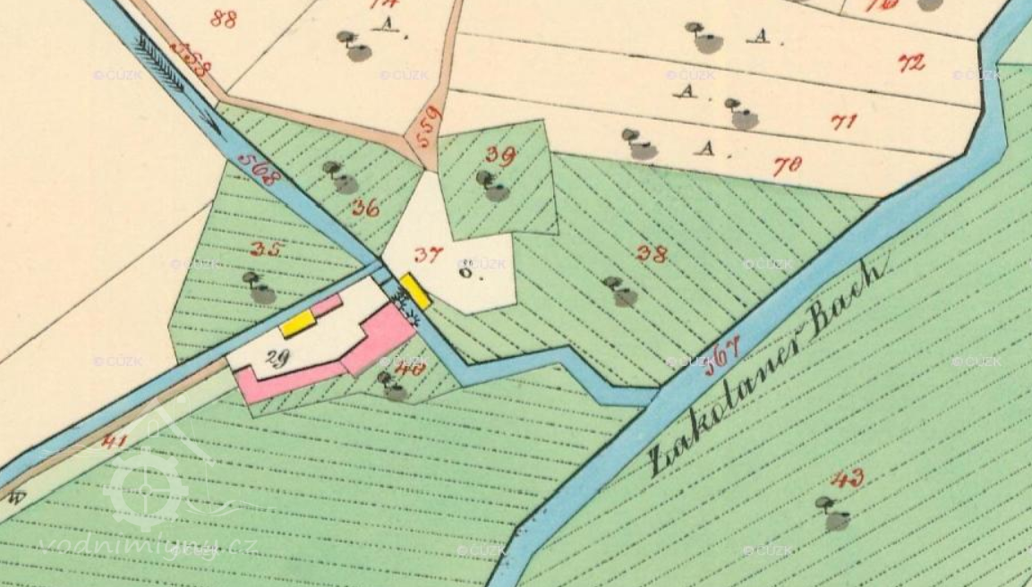 Po r. 1930 náhony postupně zavezeny, náhon ze Zákolanského potoka ještě poněkud patrný.