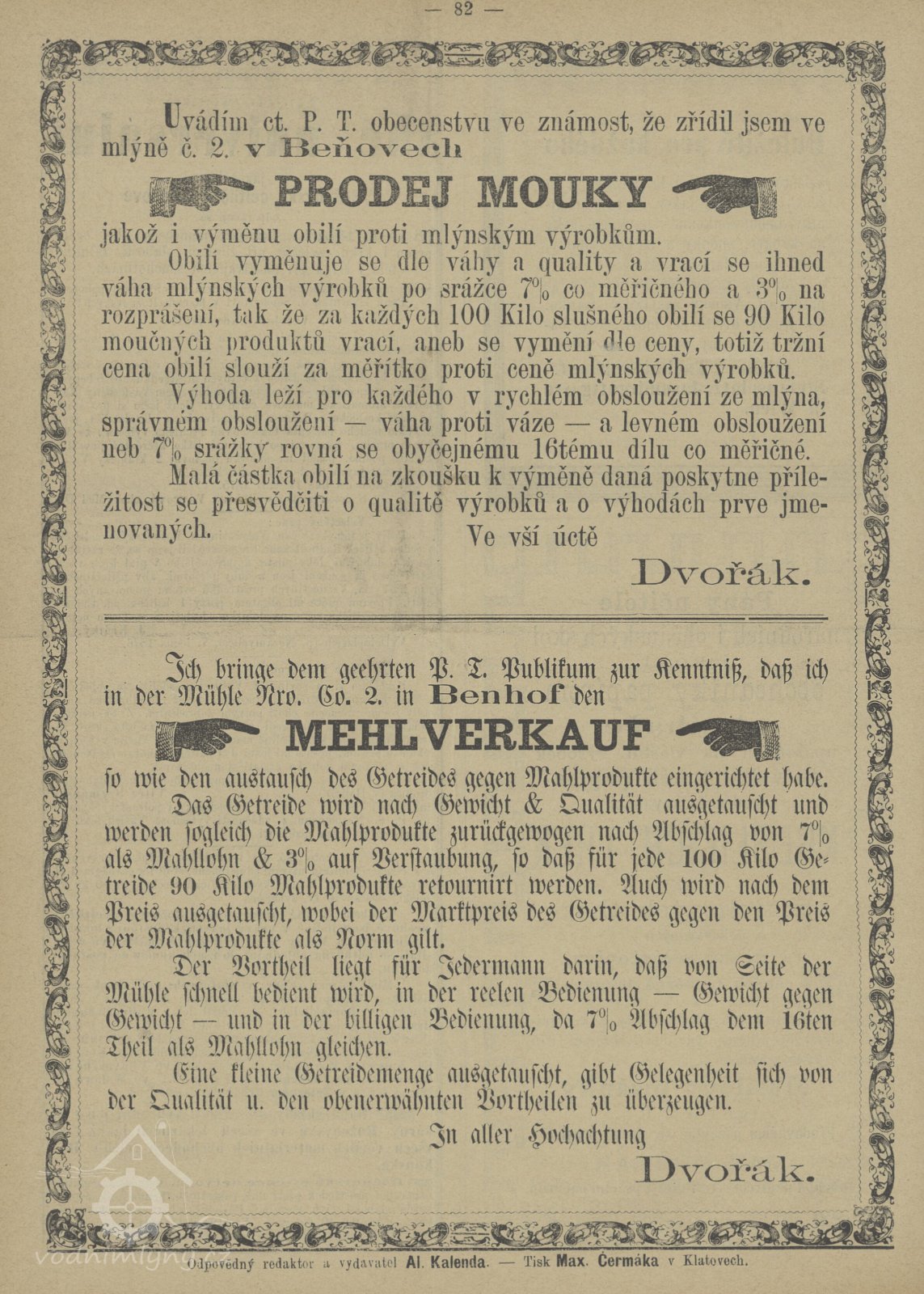 Rok 1602 - na mlýně syn předchozího mlynáře Martin Beňovský, svědčil při svatbě Martina Krebendy s Dorotou.