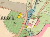V roce 1677 je zmiňován mlýn s pilou Jakuba Hačeckého „kterejž bejval o dvou kolách nebo strojích mlejnských a stoupy se kolem mlejnským táhly. Vody tok svobodný i na pilu z rybníka panského Dlouhého Hačeckého“.