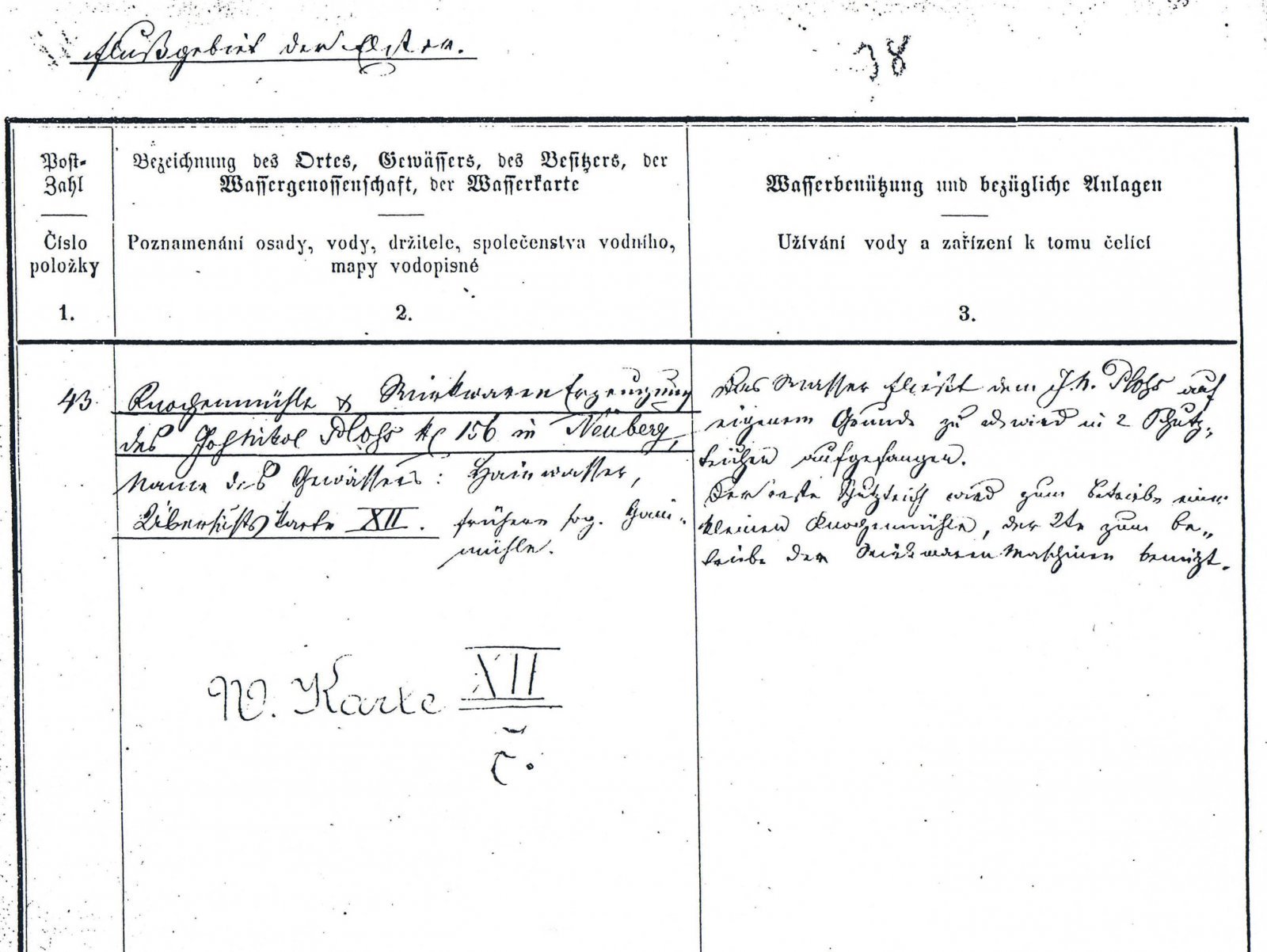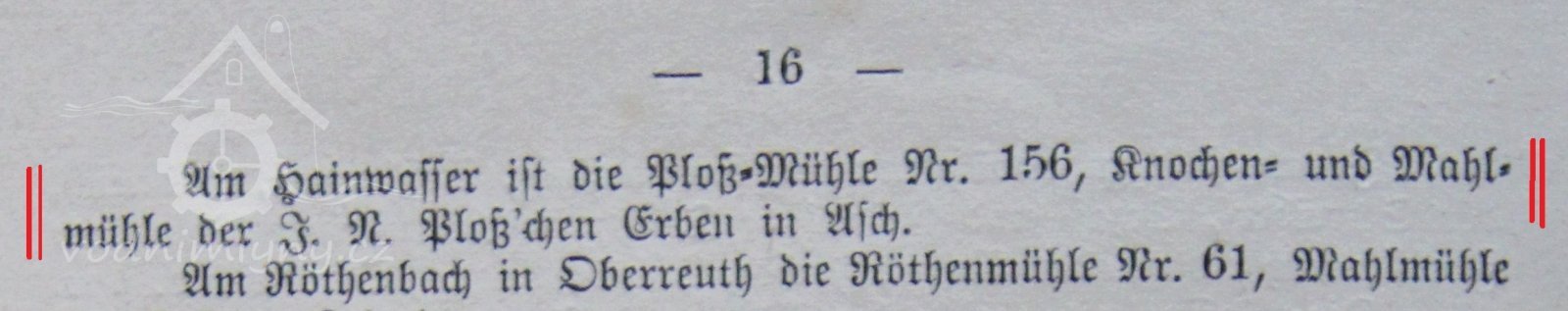 ve vodní knize je zapsáno: kostní mlýn & výroba pleteného zboží, Joh.Nikol Ploss č. 156 v Podhradí,jméno povodí: Hainwasser