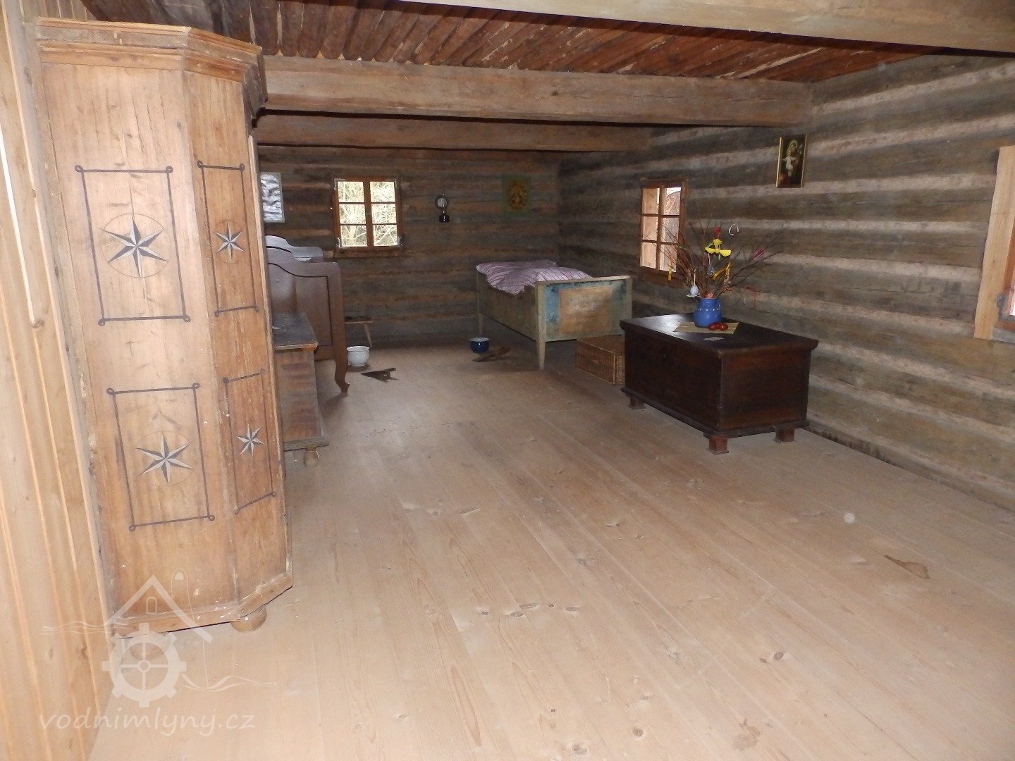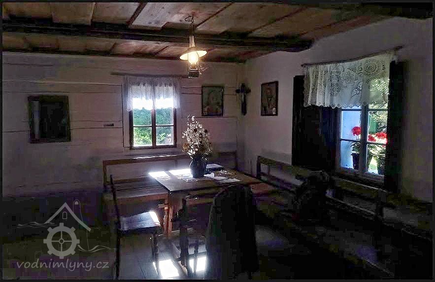 Z mlýnice je přístupný valeně zaklenutý sklípek pod obytnou dřevěnou částí /pod světnicí/, jehož neorganické napojení ukazuje na možný starší původ. Obytná část vlastního mlýna „přilepená“ na mlýnici je již patrová se sedlovou střechou. Větší část přízemních stěn je přezděna v mladší době. Na odvrácené boční straně je v délce světnice zachována jednoduše provedená podstávka, vynášející roubené patro. Postávka nepochybně existovala u štítové a boční nádvorní stěny a byla zdobena vyřezáváním. V síni jsou patrny zbytky černé kuchyně, hmota pece, přesahující líc obvodové stěny je zachována. Otevřený otvor konicky se zužujícího komína, v místech nad jádrem černé kuchyně /ústí do pece ohniště/, ukazuje na možný převoz otevřeného ohniště. Trámové stropy ve světnici jsou zakryty novějším rovným podhledem. Zde jsou rovněž patrné zbytky po kachlových kamnech, vytápěných původně ze síně. Patro je přístupné ze síně dřevěným schodištěm. V šířce síňové části je zapuštěna pavlač. Stropy v síni i patrové světnici jsou trámové se záklopem. Okno v síni má zasouvací vnitřní okenici. Krov se stojatou stolicí je pravděpodobně mladší. Roubení obytné části je již vázáno na „zámky“. Velmi významným nálezem je původní dřevěný lepenicí omazaný komín. Dřevěný roubený a omazávaný komín prochází šikmo půdou mlýna. Podle úsporného a vyspělého zvládnutí stavby (obytná část) lze předpokládat její vznik kolem r. 1800.