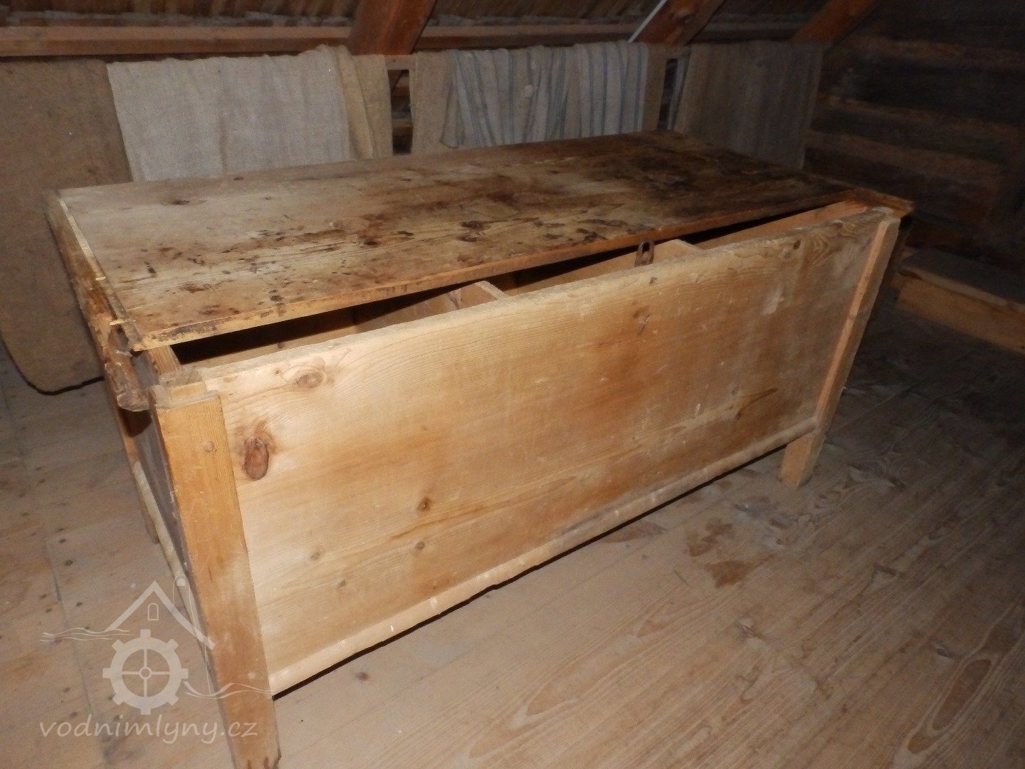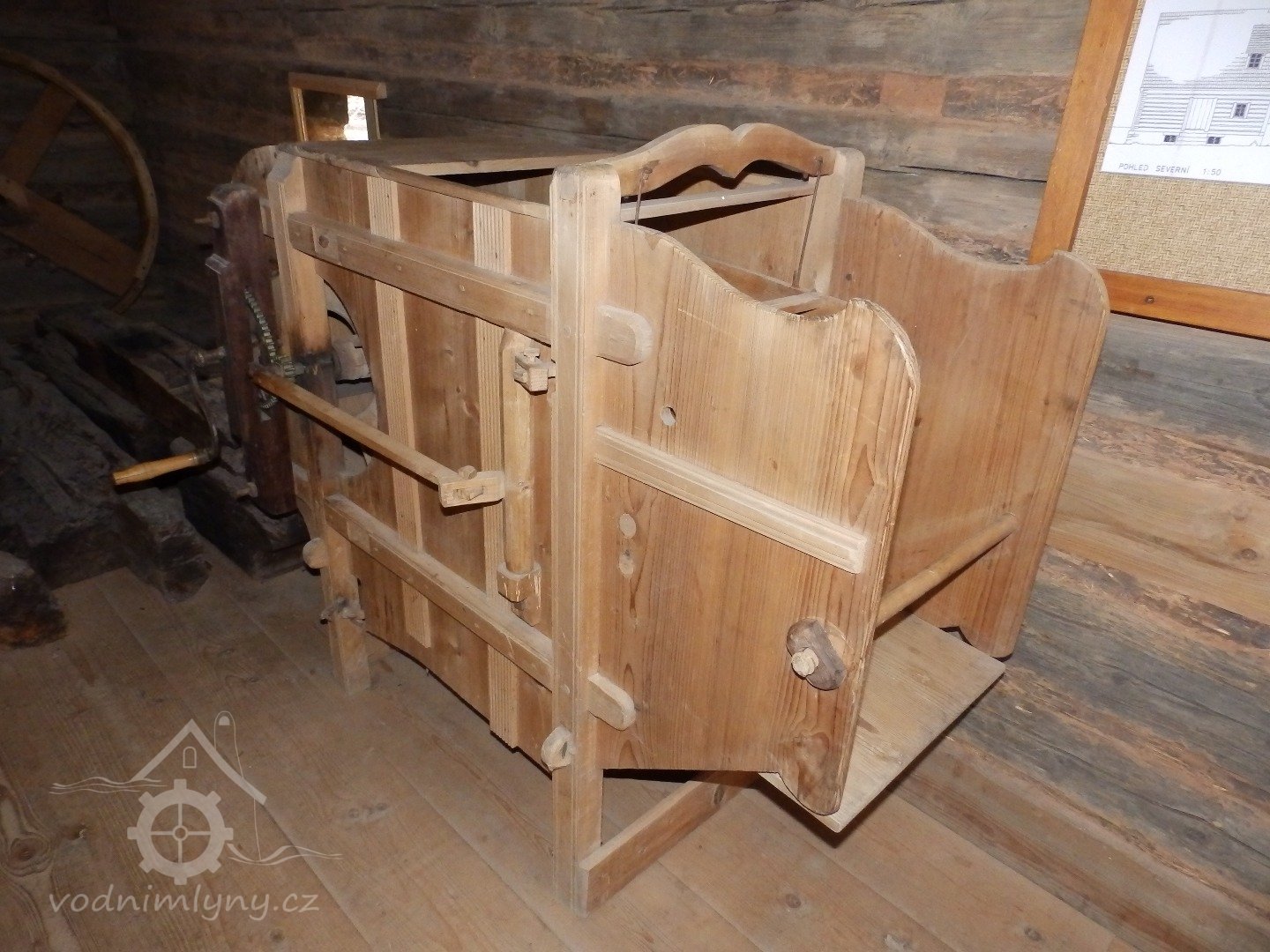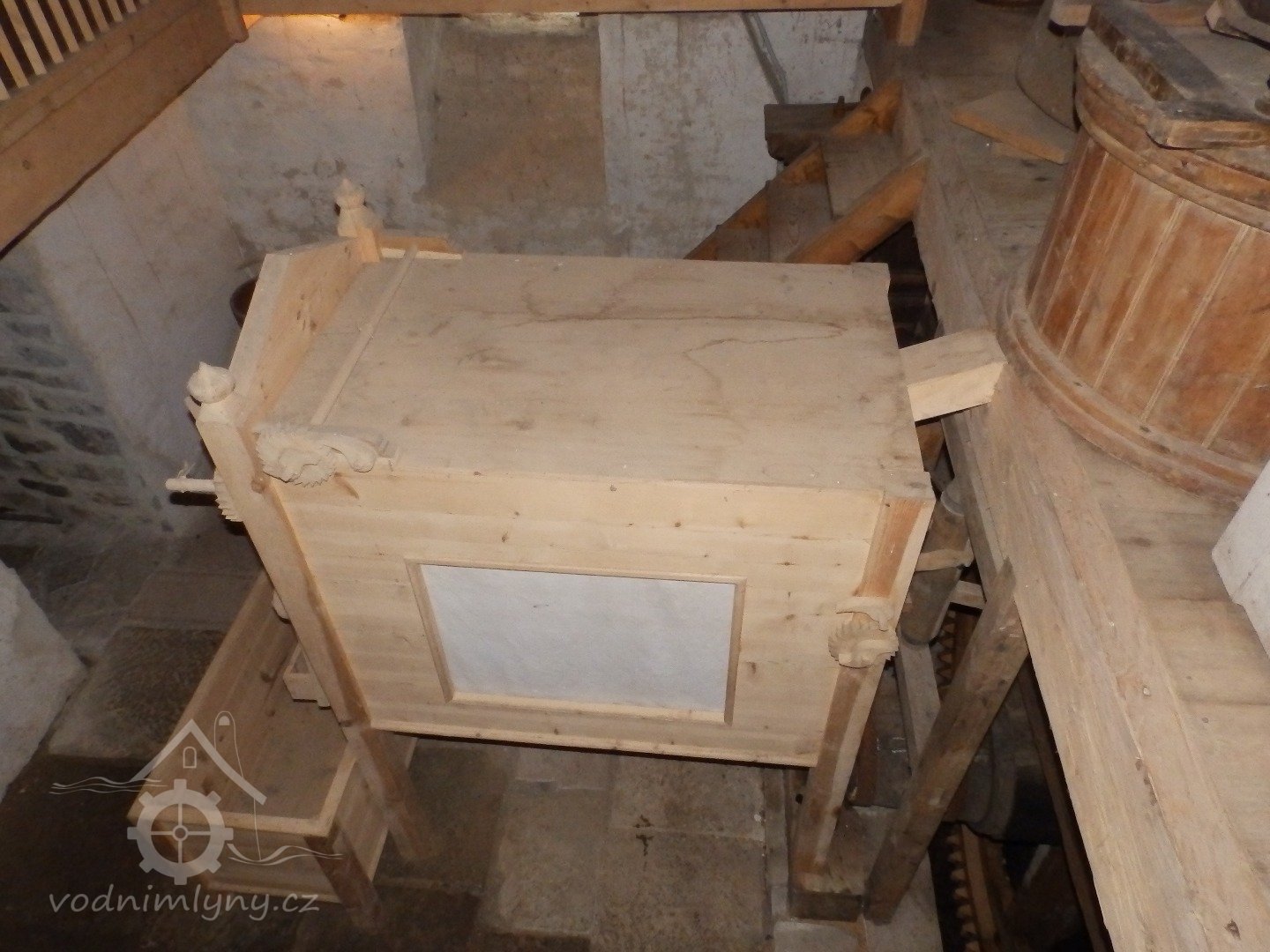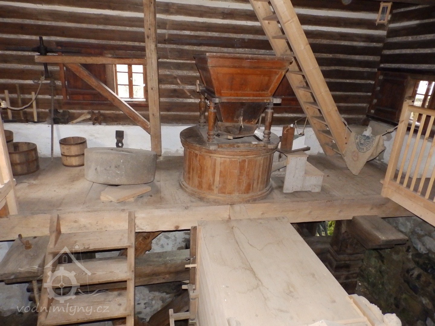 Zrekonstruované obyčejné složení s replikou moučnice. Původní vyřezávaná hranice s vročením 1803. Lub a násypný koš transferován ze zbořeného mlýna v Malých Žernosekách.